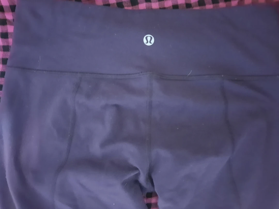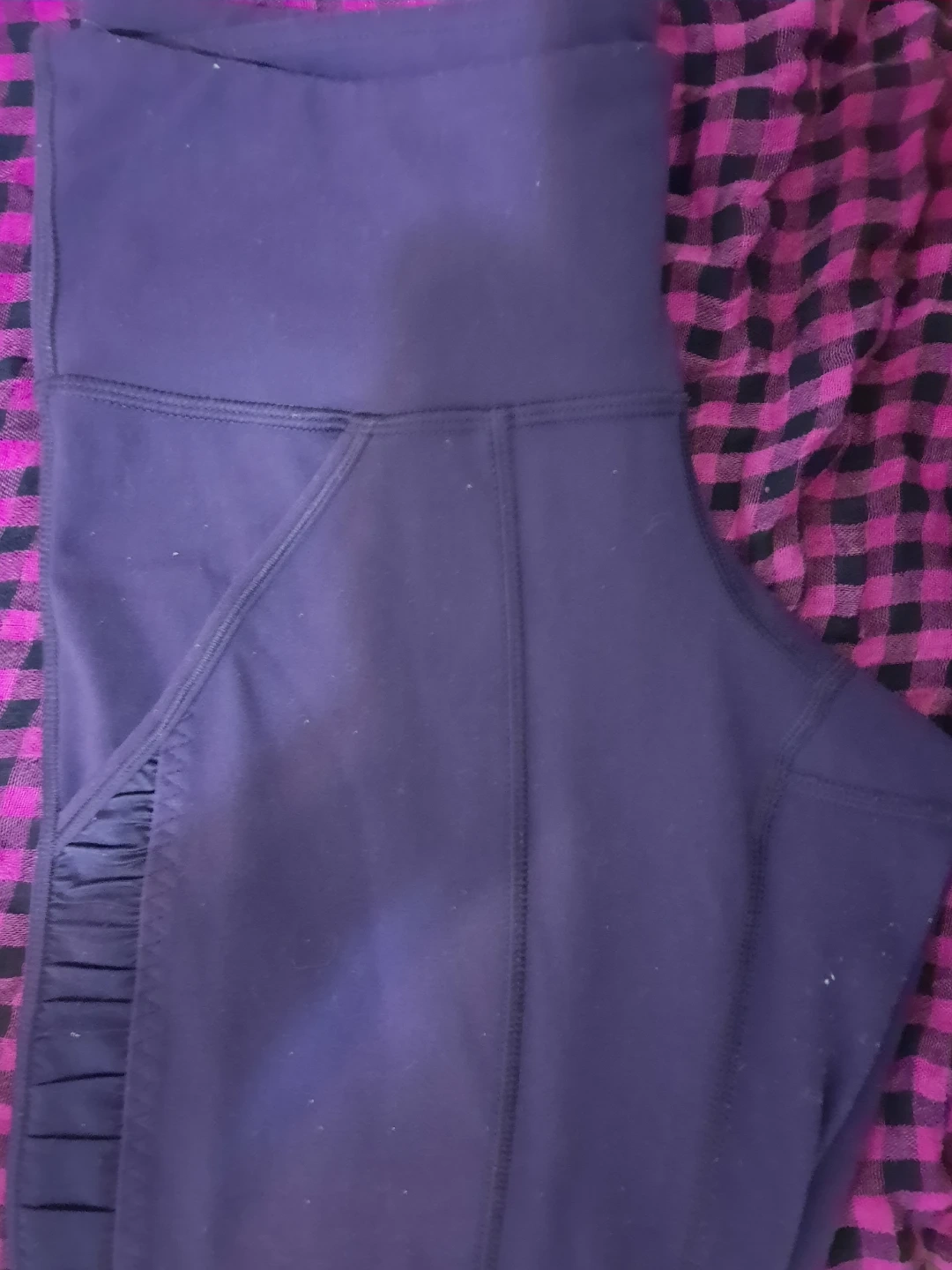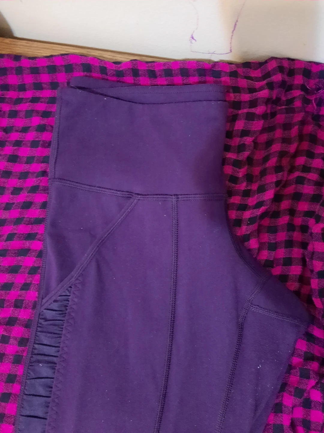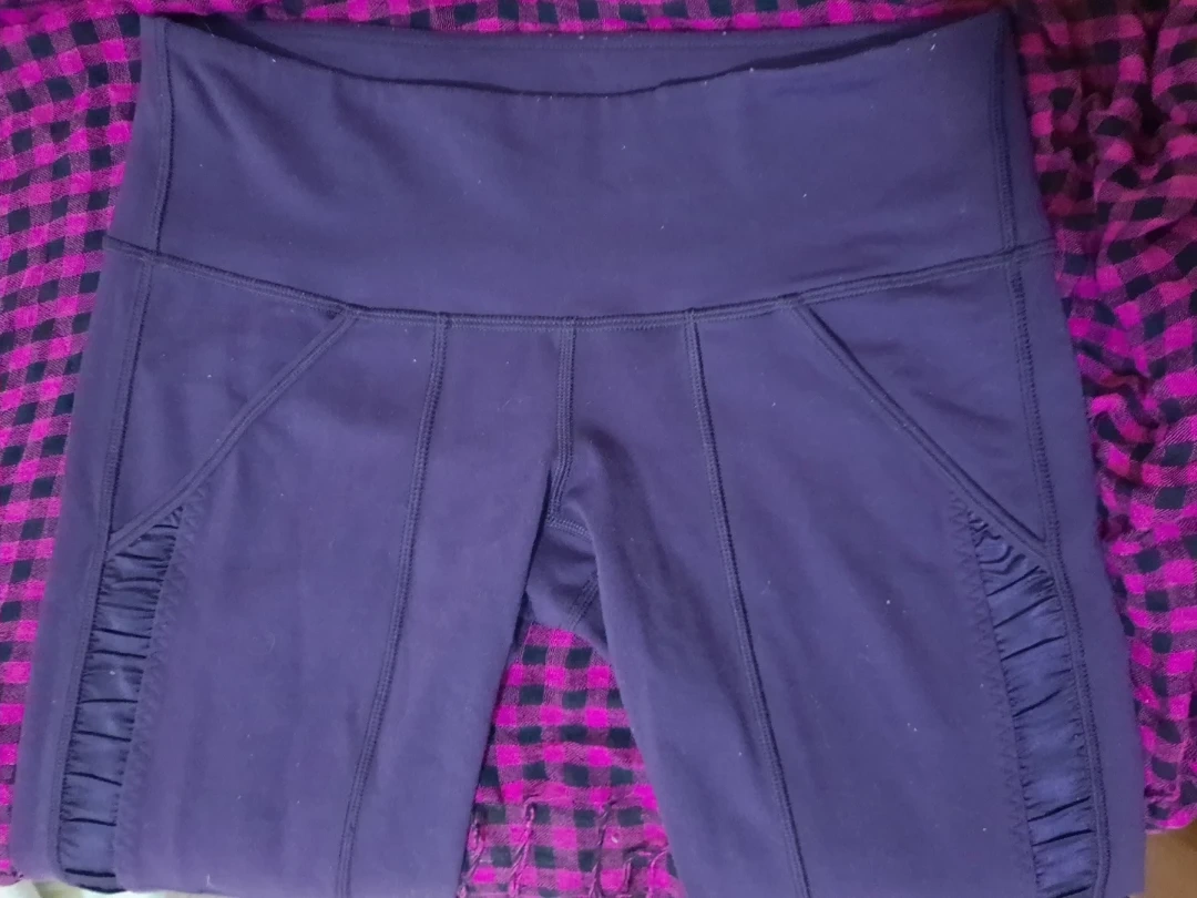These Lululemon leggings are a deep purple colour. They feature a ruched detail on the sides. Great for workouts or casual wear!