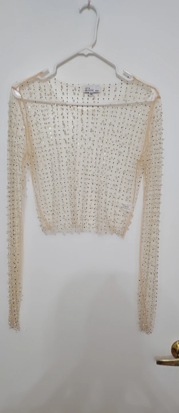 1000+Selling a Nasty Gal embellished mesh top in size 6! It's a beautiful piece with pearl and iridescent bead detailing. Perfect for a night out or special occasion