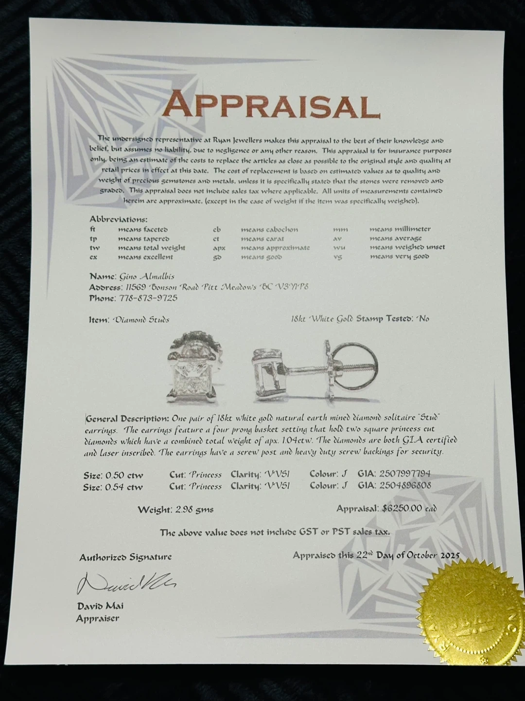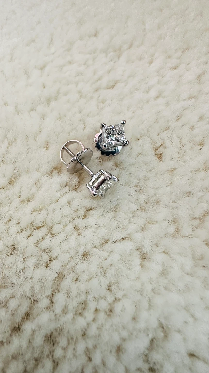 68Selling a beautiful pair of 18kt white gold natural earth mined diamond solitaire stud earrings. They feature a four-prong basket setting that holds two square princess cut diamonds which have a combined total weight of approx 1.04ctw. The diamonds are both GIA certified and laser inscribed. The earrings have a screw post and heavy duty screw backings for security. Appraised on 2025 October 22 for $6250 cad