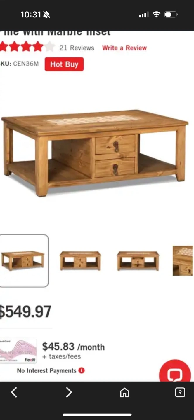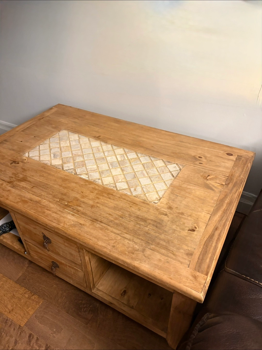 1547.25" Rustic Coffee Table with Storage and Shelf - Natural Pine with Marble Inset Selling a wood coffee table with a marble inset. It has two drawers and an open shelf for storage. It's in good condition and would look great in any living room. Originally bought for $549.97 Santa Fe Rustico 47.25" Rustic Coffee Table with Storage and Shelf - Natural Pine with Marble Inset Weight 78.00 lbs (35.4 kg)) Width: 47.25" (120.0 cm) Height: 17.75" (45.1 cm) Depth: 31.5" (80.0 cm)