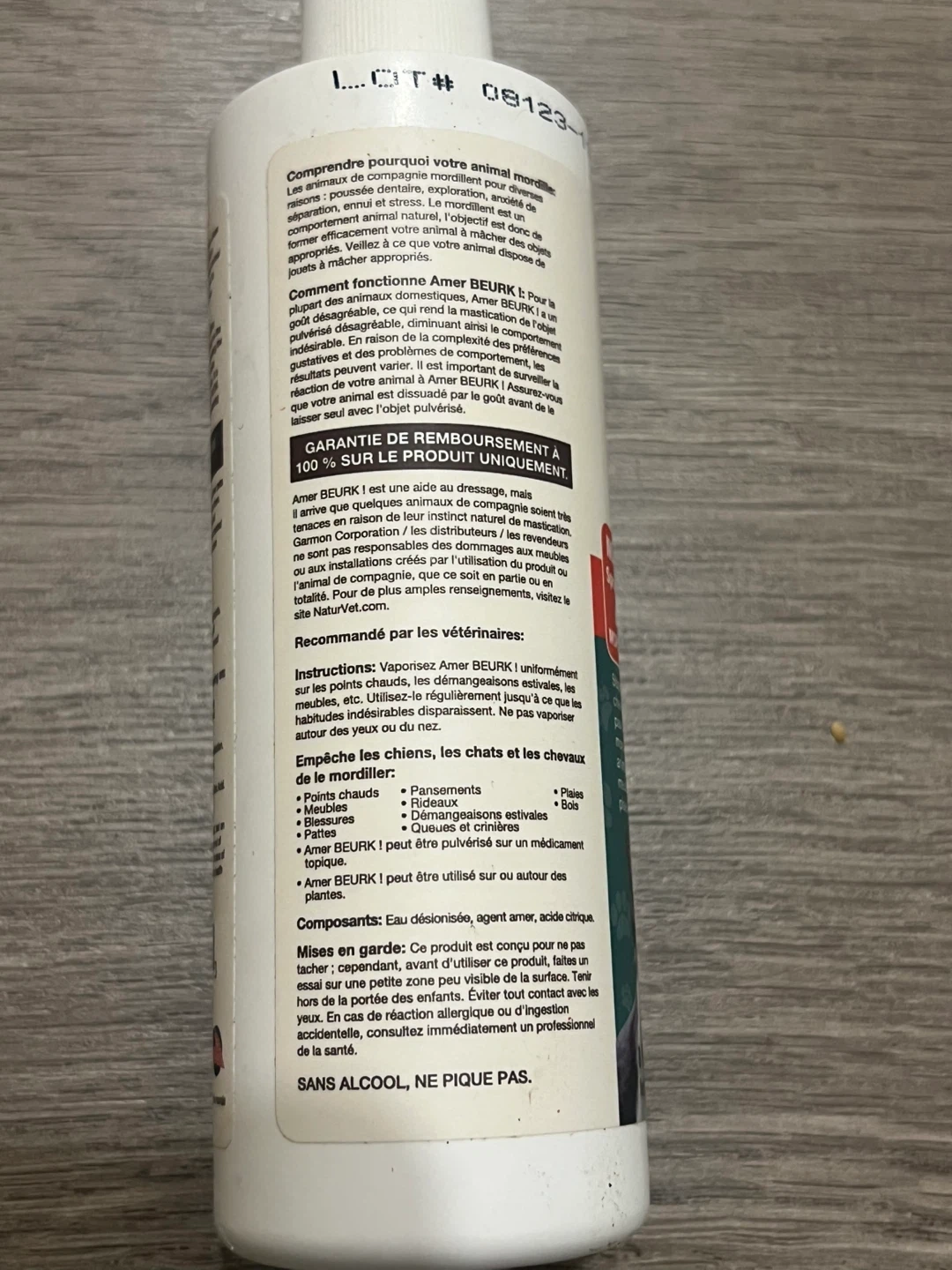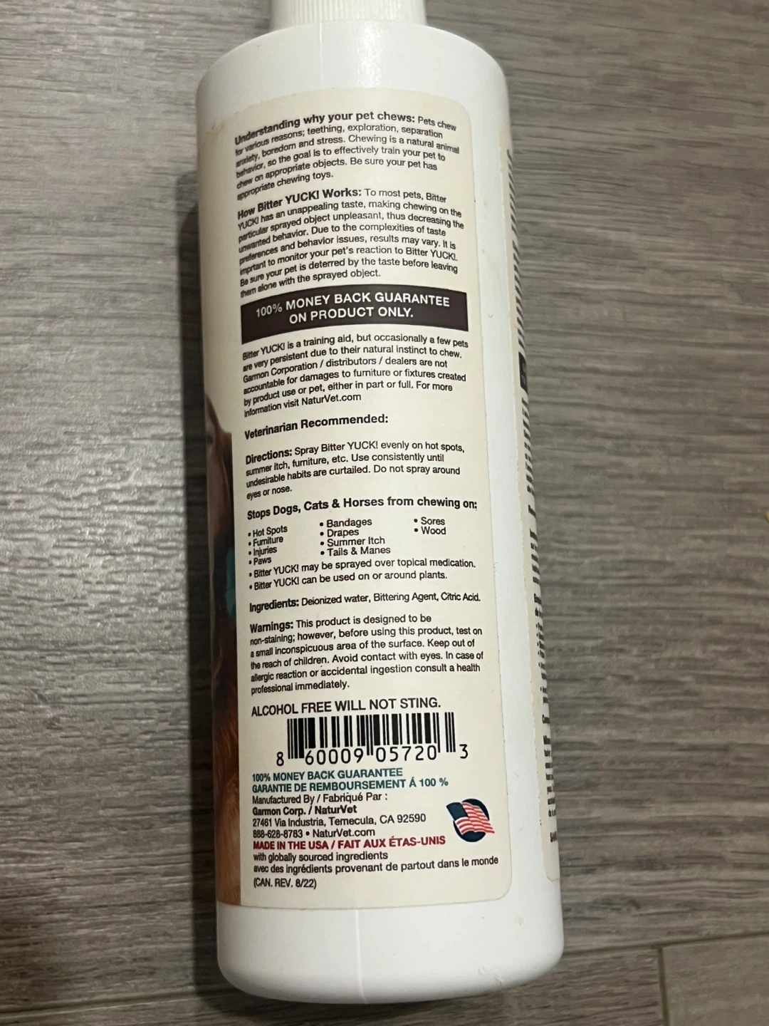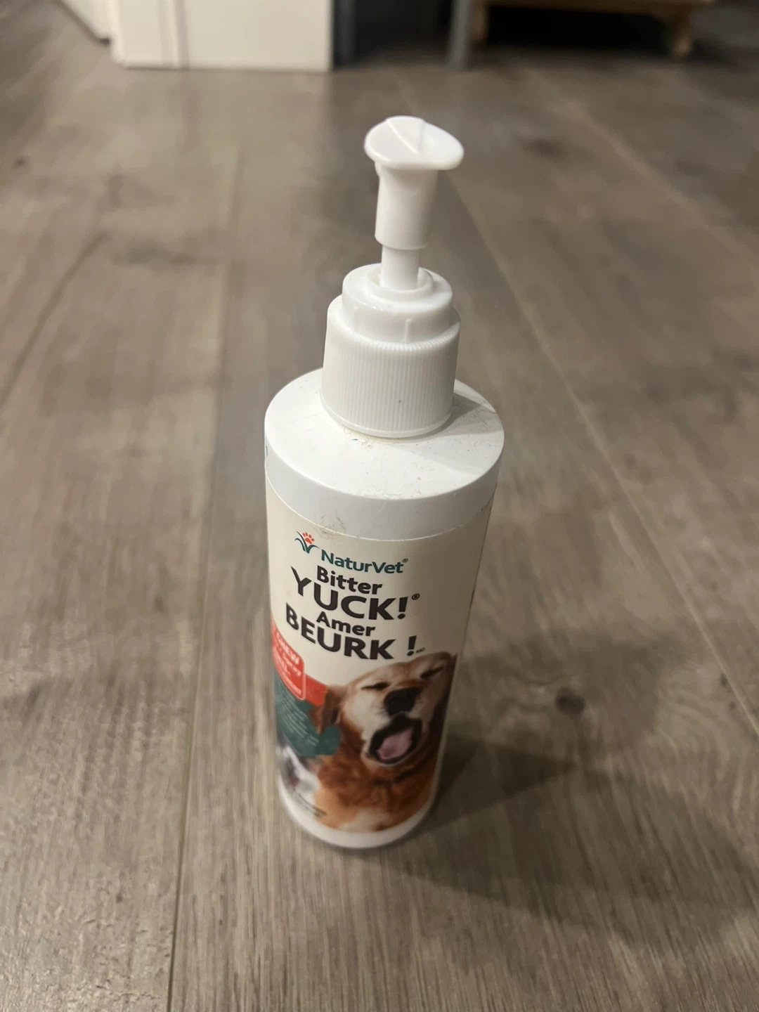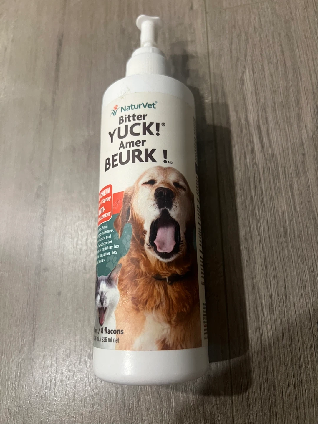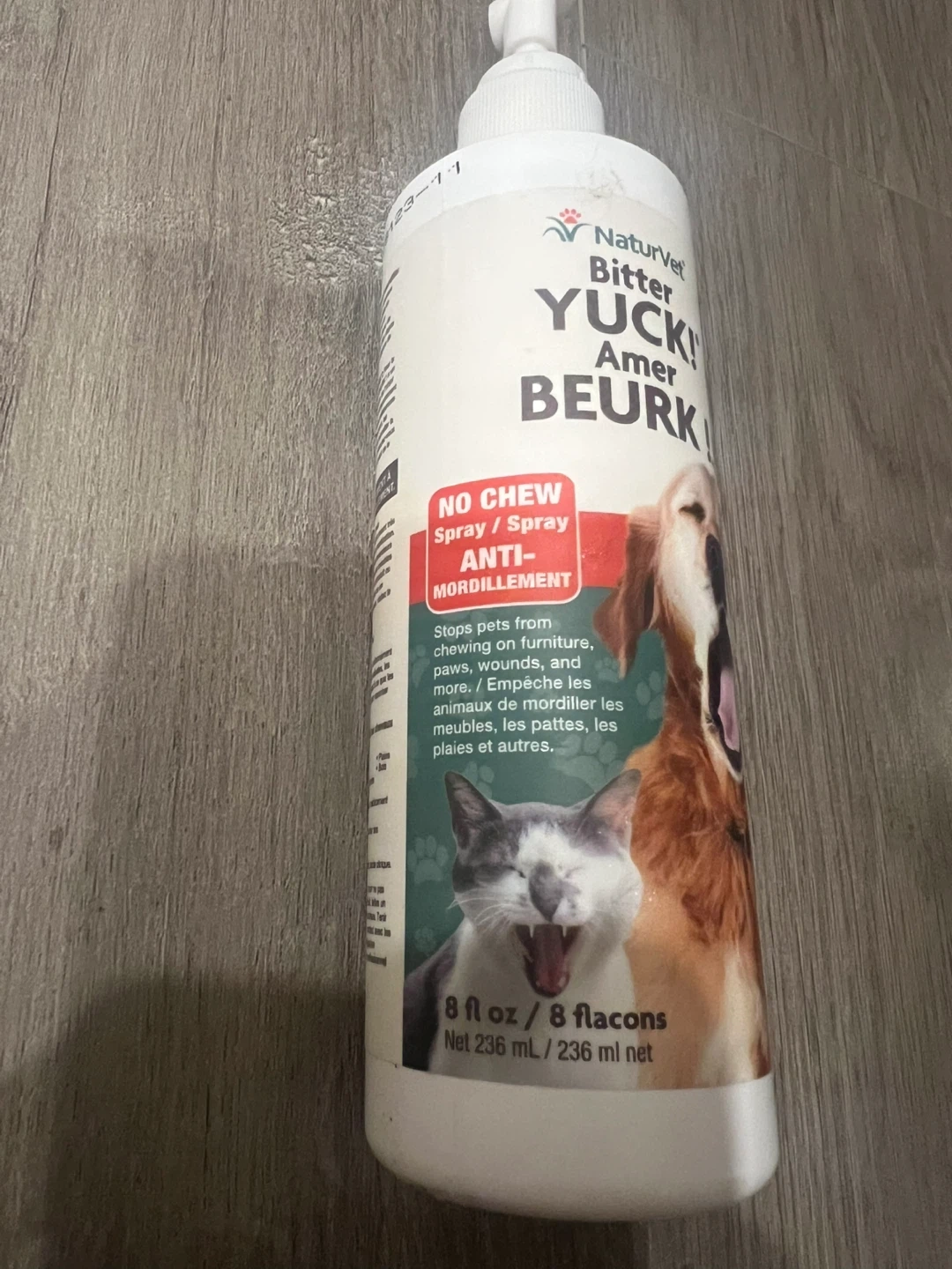 Show allUsed NaturVet Bitter YUCK! Amer BEURK! No Chew Spray. - Stops pets from chewing on furniture, paws, wounds, and more - about 3/4 left of 8 fl oz / 8 flacons (Net 236 mL / 236 ml)