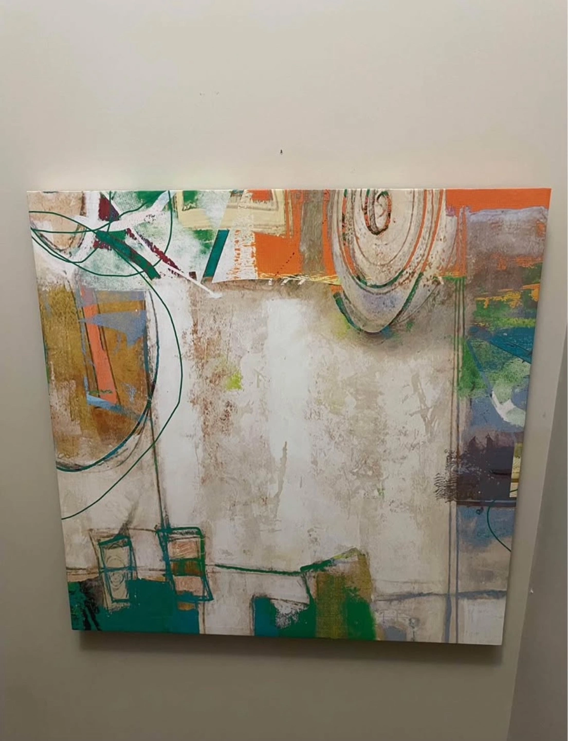 Large abstract canvas print. Neutral colours with pops of orange and teal. Modern and stylish. Perfect for a living room or bedroom.