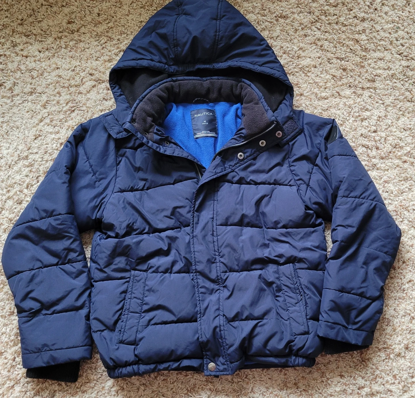 25Excellent used condition. Cozy and warm Nautica kids' puffer jacket in size 10/12! This jacket is perfect for keeping your little one snug during the colder months. It features a hood and a comfortable lining. Non smoking pet friendly home