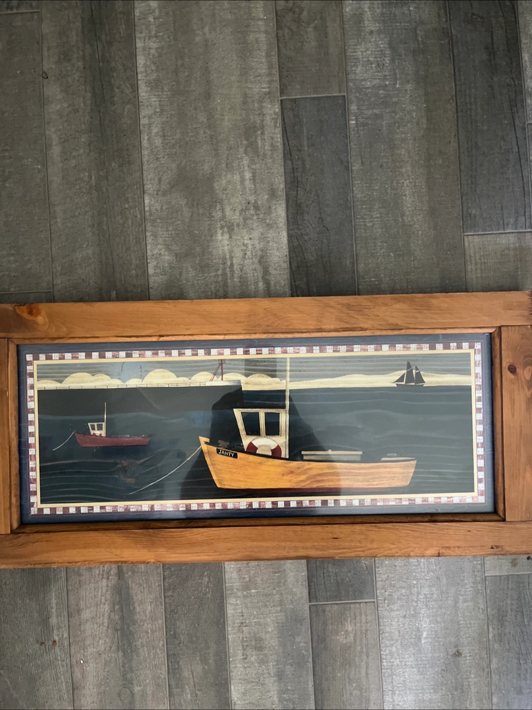 369Lovely framed artwork depicting two boats at sea. Wooden frame. Measures approximately 12" x 24". Perfect coastal decor.