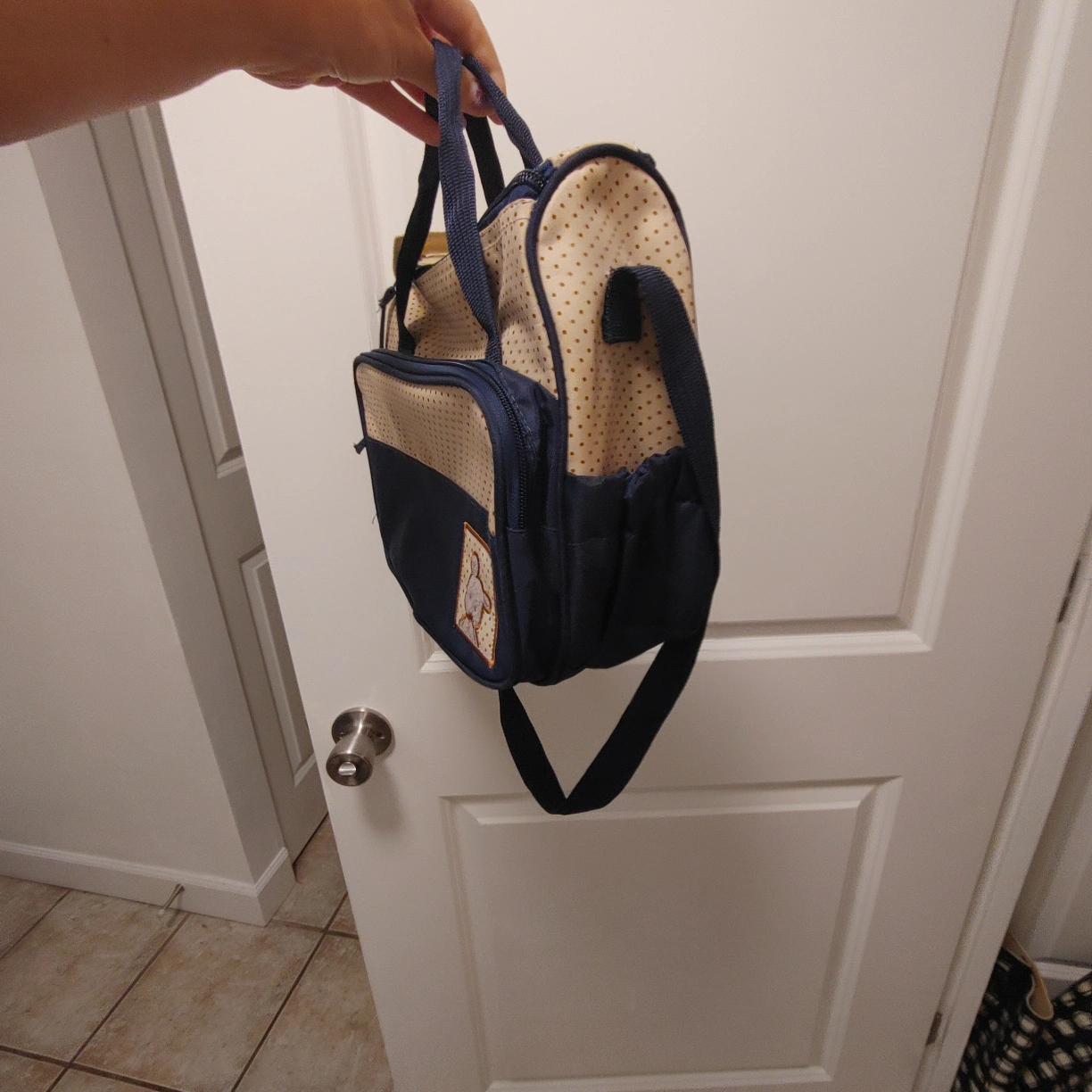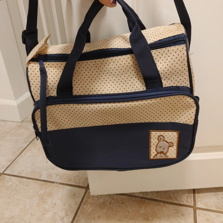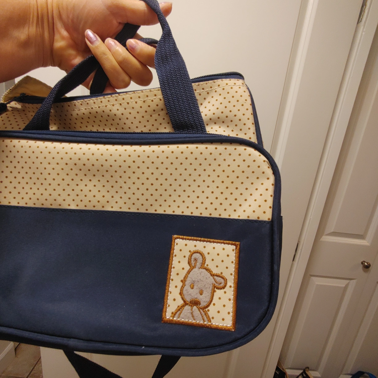 Here's a cute diaper bag in navy and beige! It features a sweet little bear design. Perfect for carrying all your baby essentials in style
