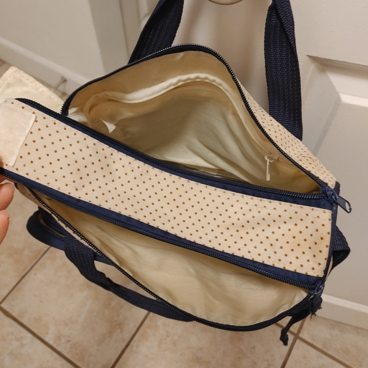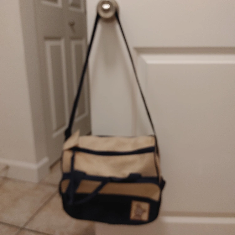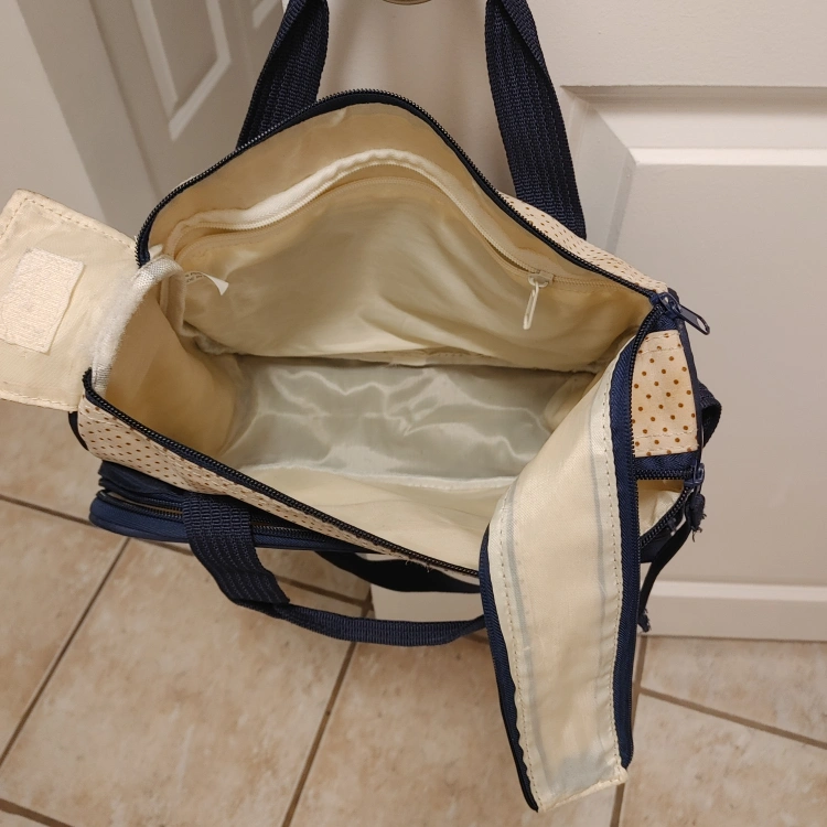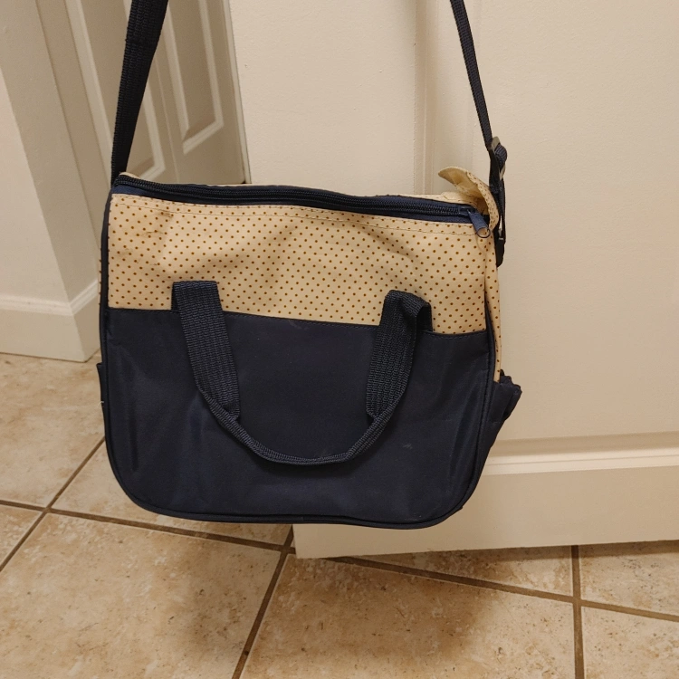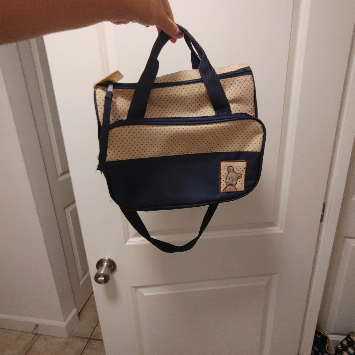 Here's a cute diaper bag in navy and beige! It features a sweet little bear design. Perfect for carrying all your baby essentials in style