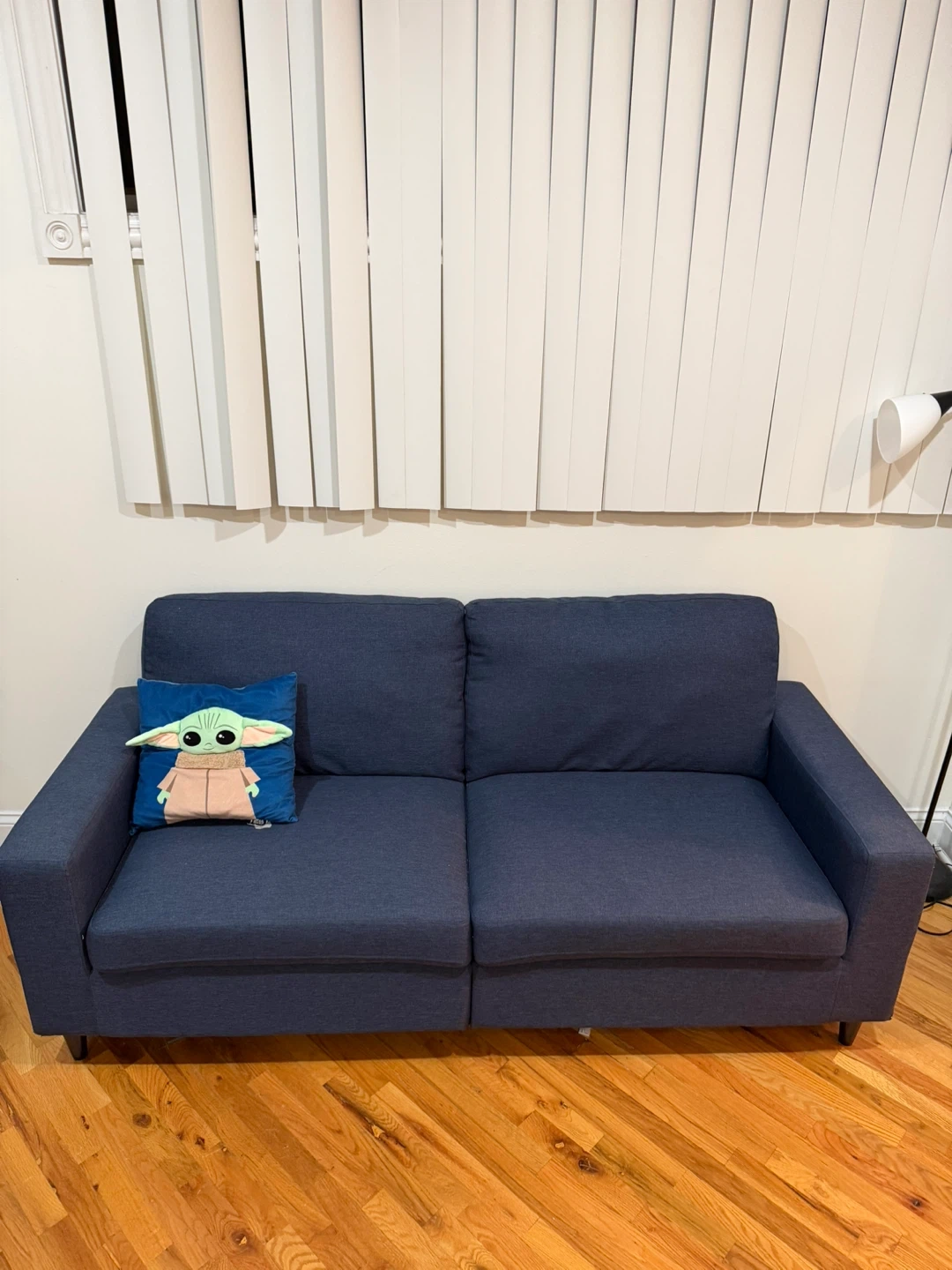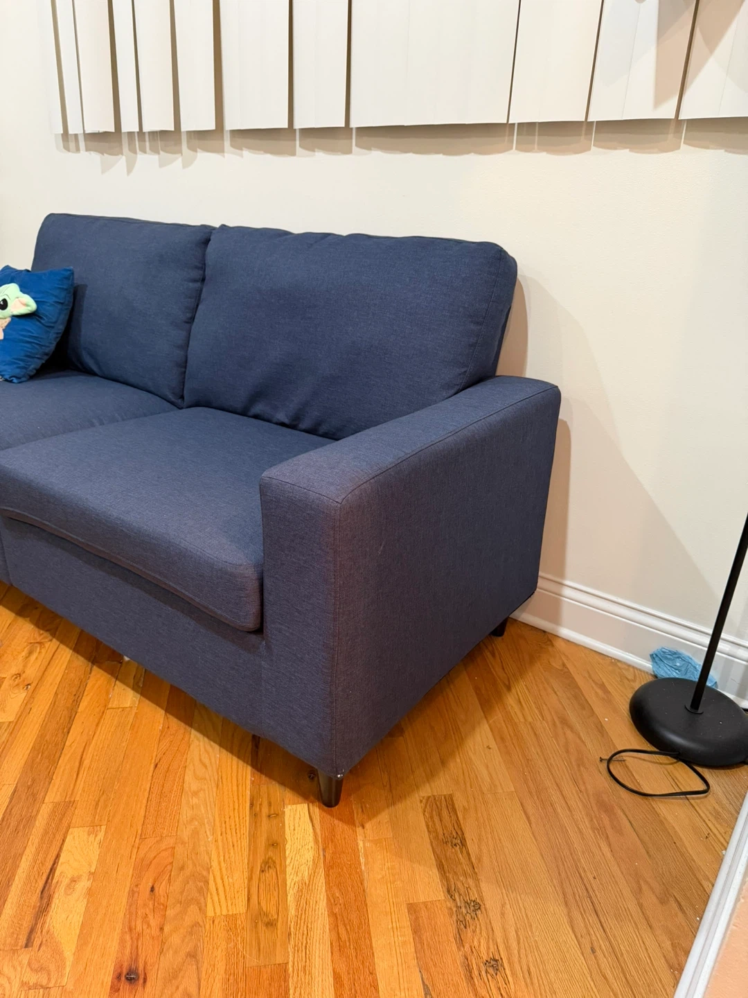 65This navy blue sofa features a modern design that blends well with all decors. It has a firm and supportive seat with a plush comfy back. The soft back cushions and padded arms add to the comfort, and it's easy to clean. The legs are made of wood-look plastic