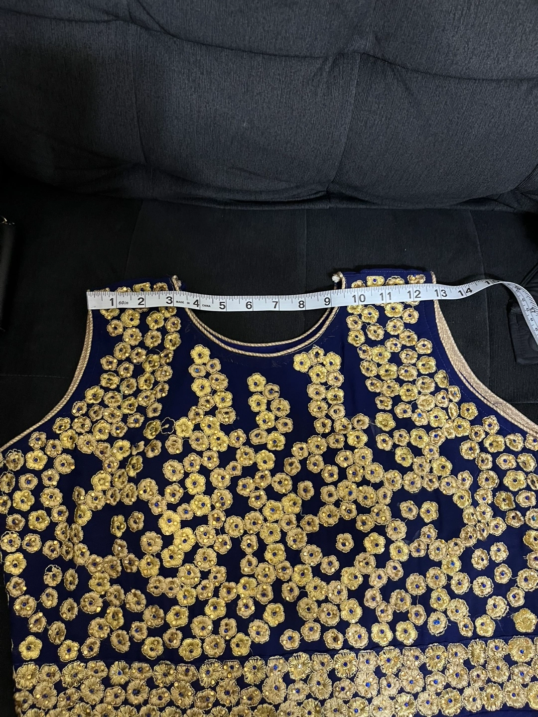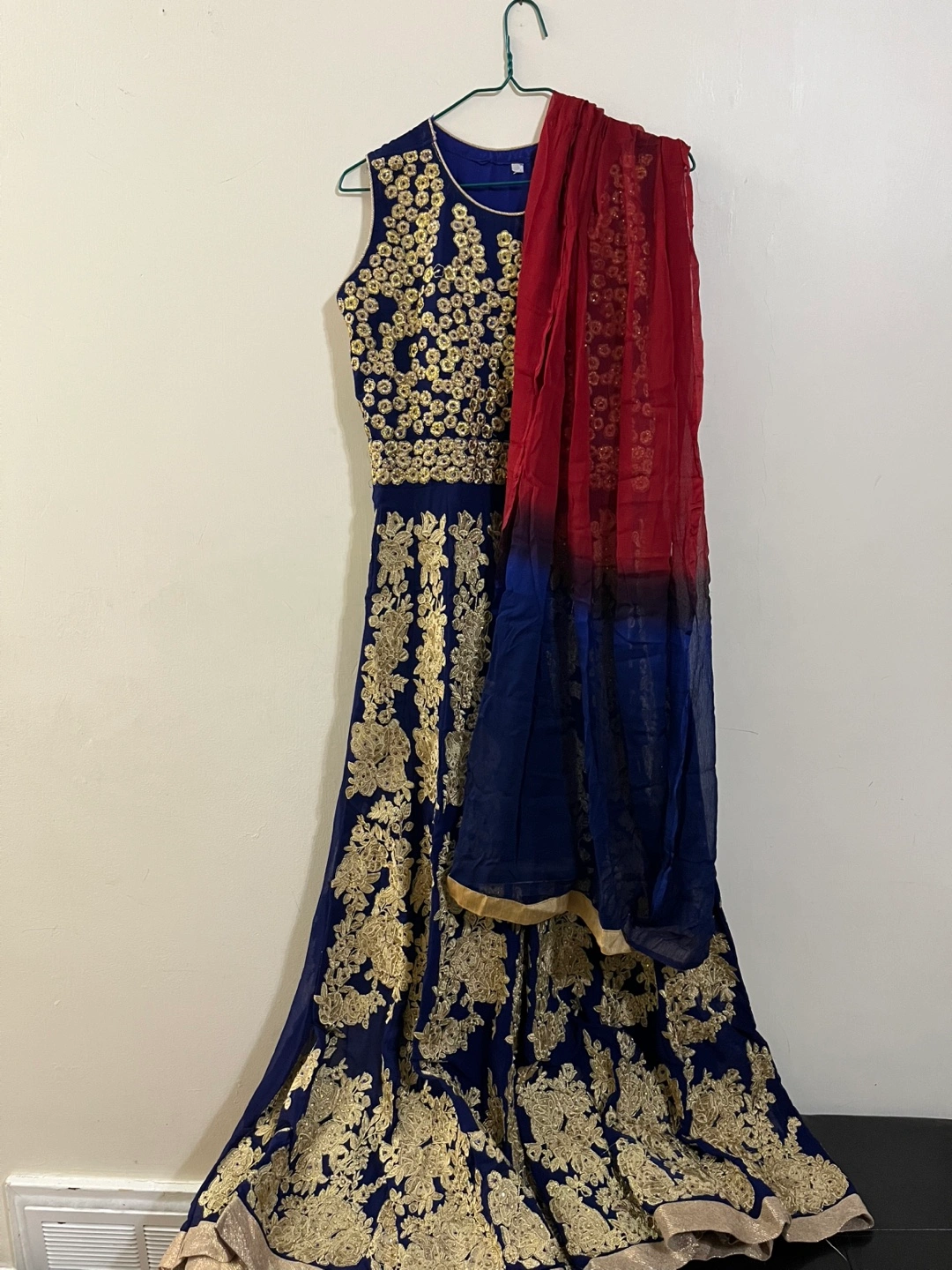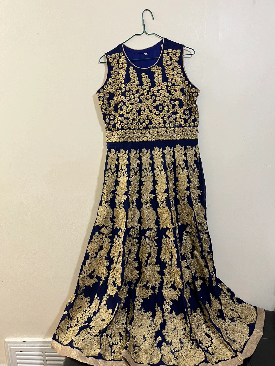 Stunning floor-length gown. Features intricate gold embroidery. Navy blue base colour. Includes matching dupatta. Pictures of measurements included. 57 inches long.