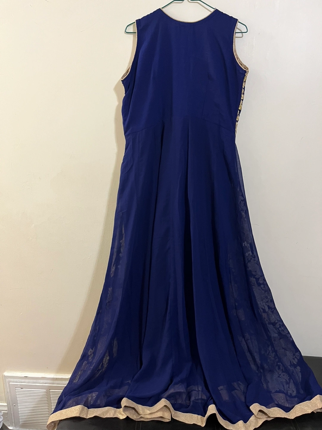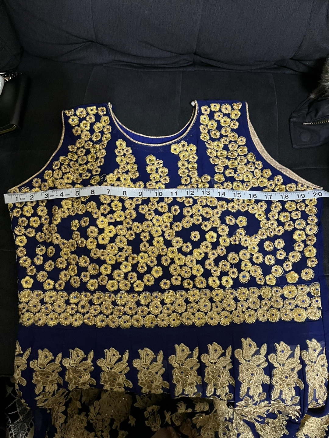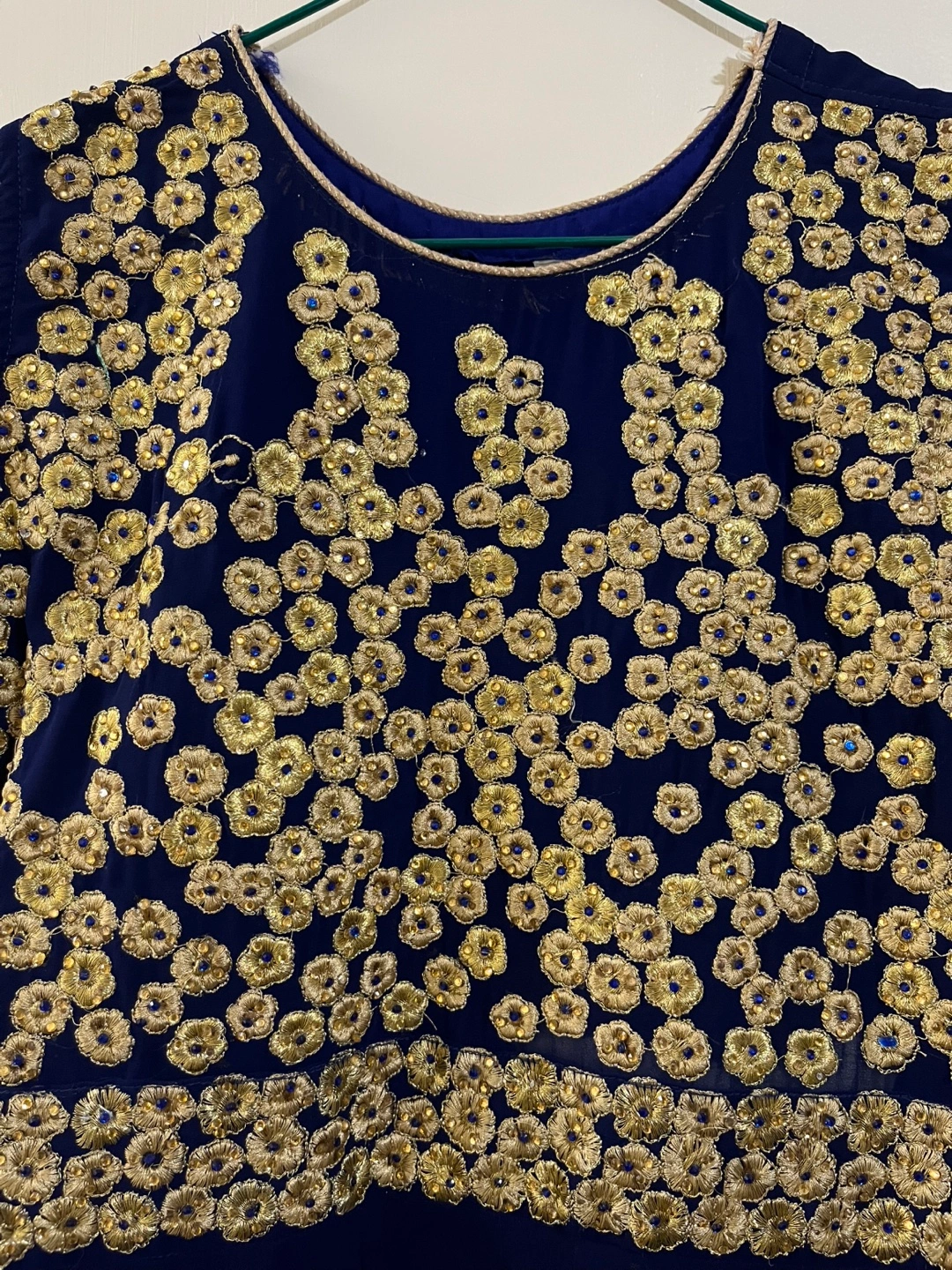 Stunning floor-length gown. Features intricate gold embroidery. Navy blue base colour. Includes matching dupatta. Pictures of measurements included. 57 inches long.