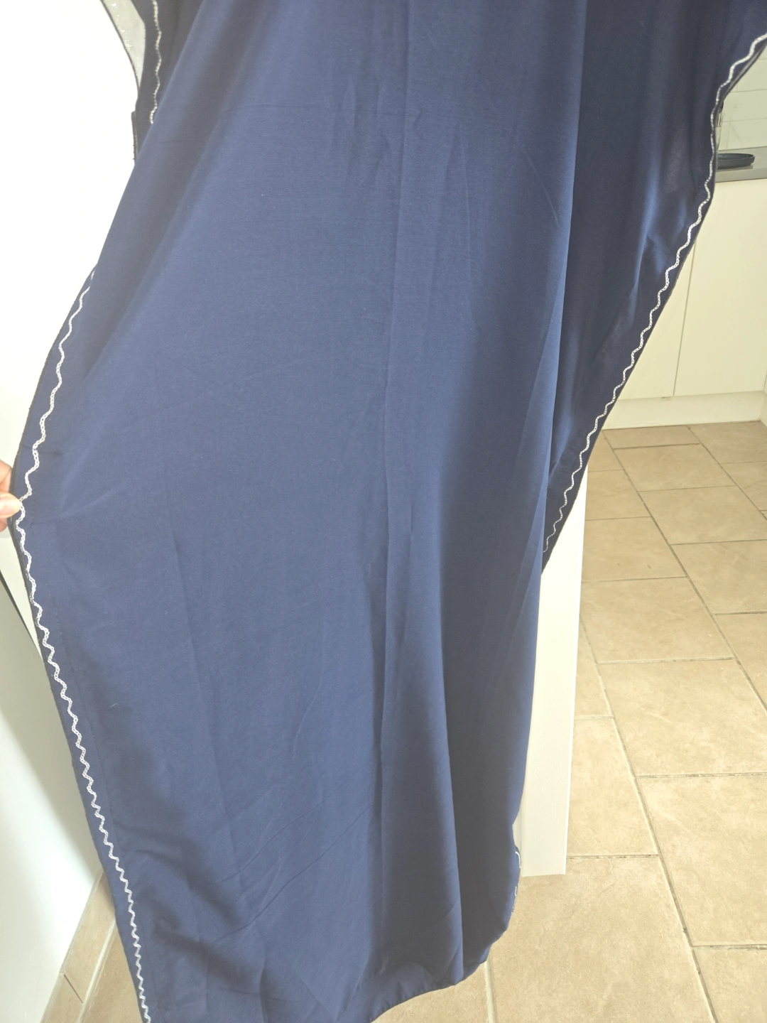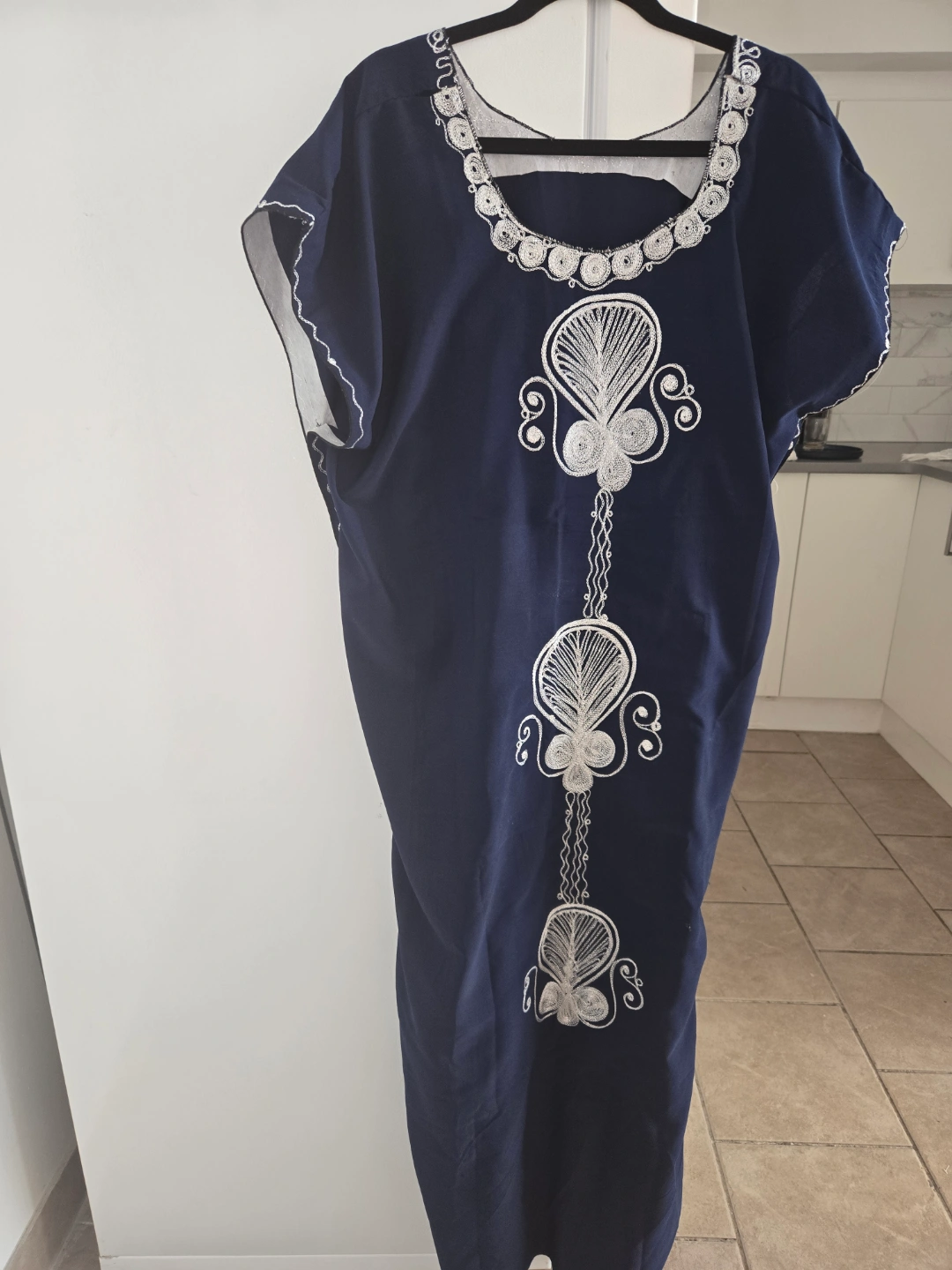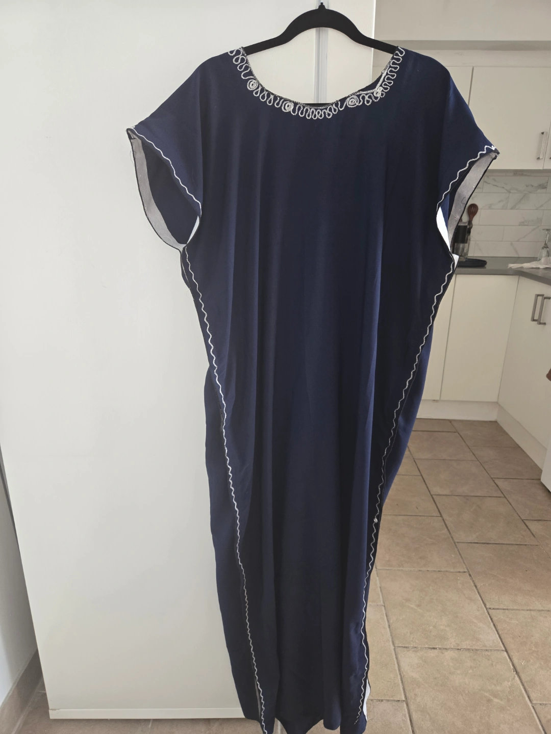 Long navy blue caftan. Features white embroidery detailing. Short sleeves. Relaxed fit. Side seams.