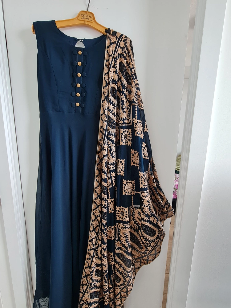 10Beautiful navy blue full flare gown dress with heavy embroidery dupatta. The dress features a round neckline with button details and a flowing silhouette. The dupatta has an intricate embroidered pattern. Perfect for special occasions!