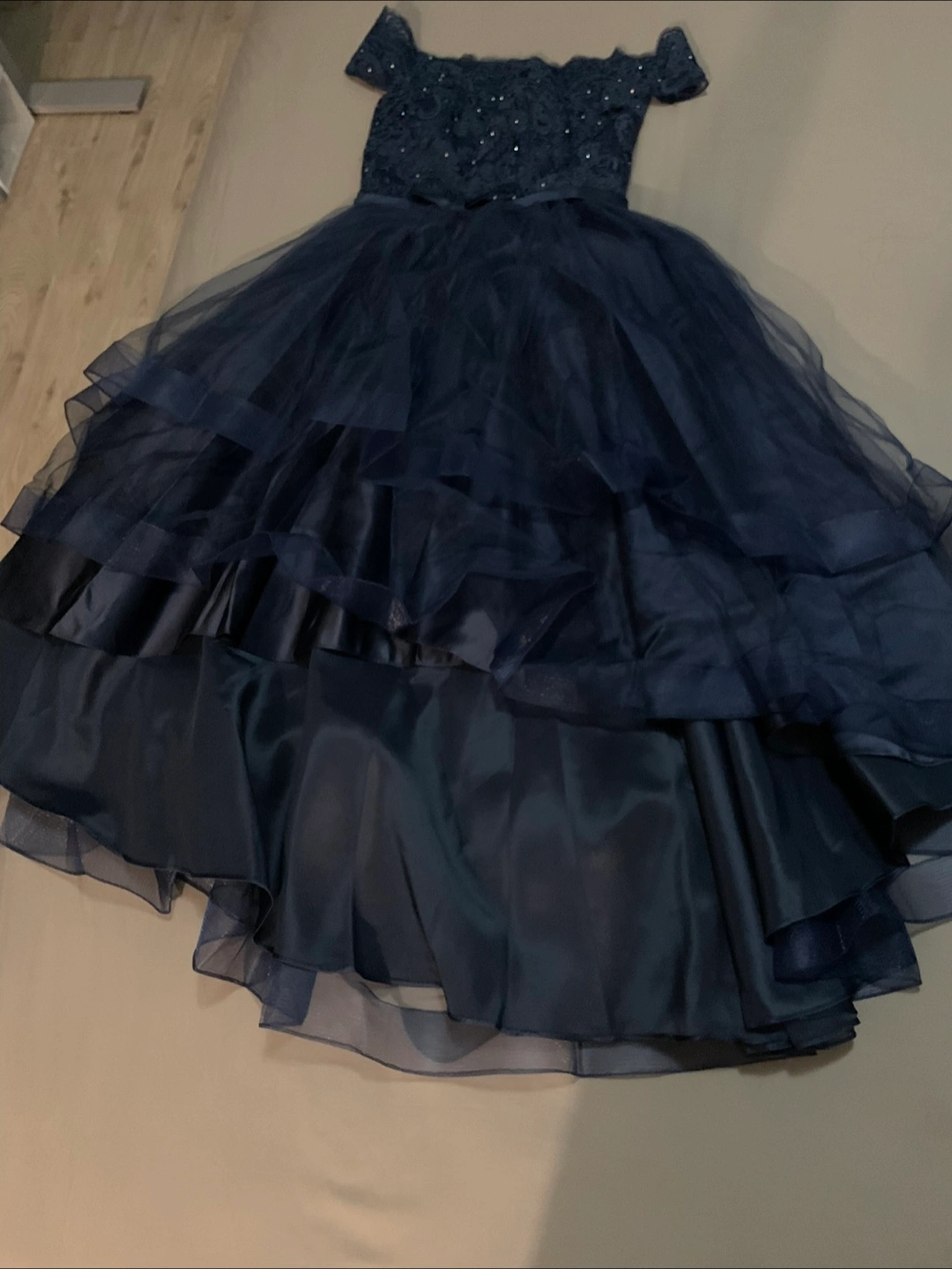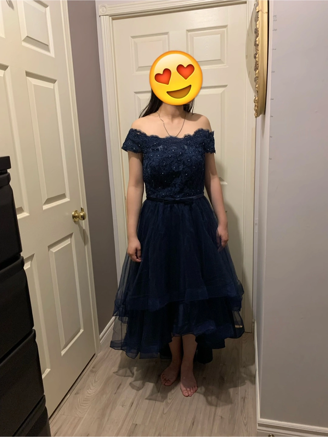 224Beautiful navy blue formal dress. Features off-the-shoulder neckline, layered tulle skirt, and high-low hemline. Lace bodice with beaded accents. Perfect for prom, special occasion, or wedding.