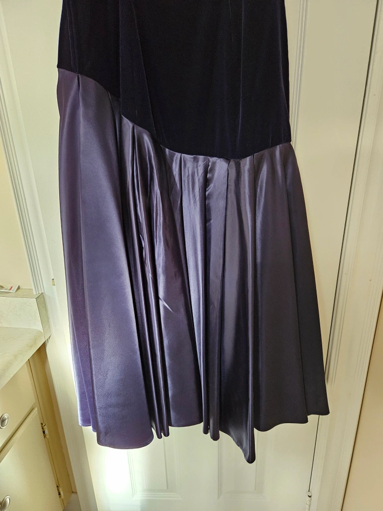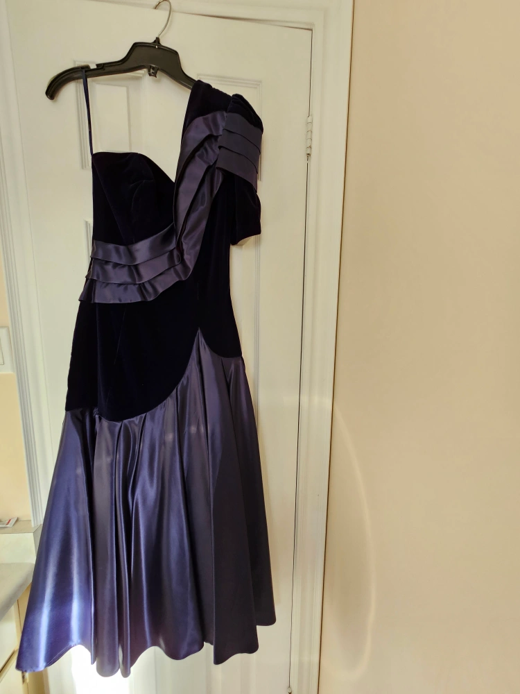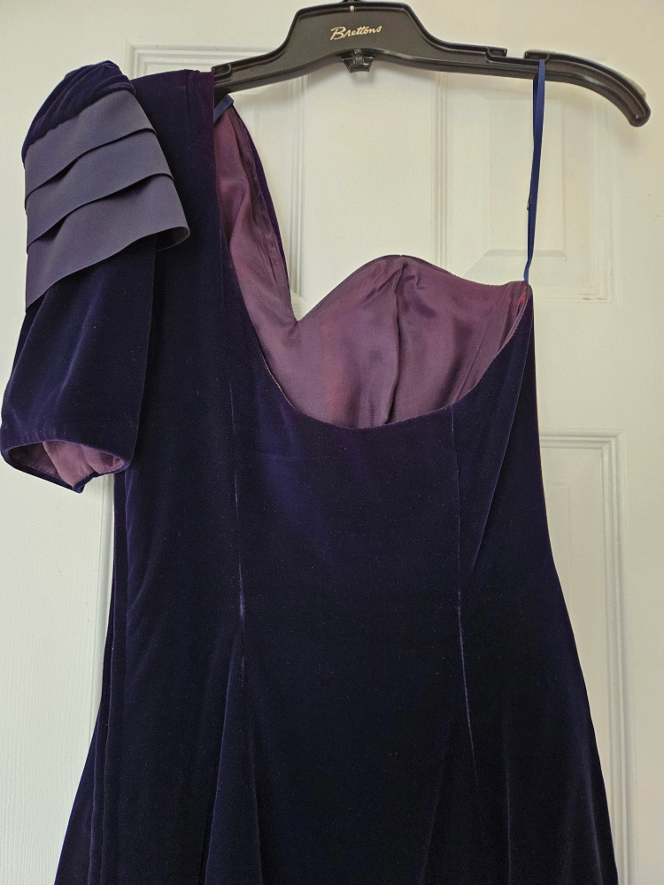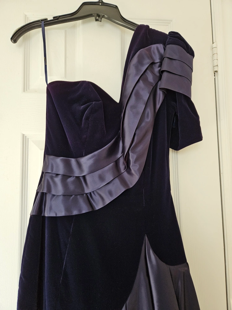 10Selling a beautiful navy blue one-shoulder party dress. The dress features a velvet bodice and a satin skirt. It's in great condition and ready for a night out!