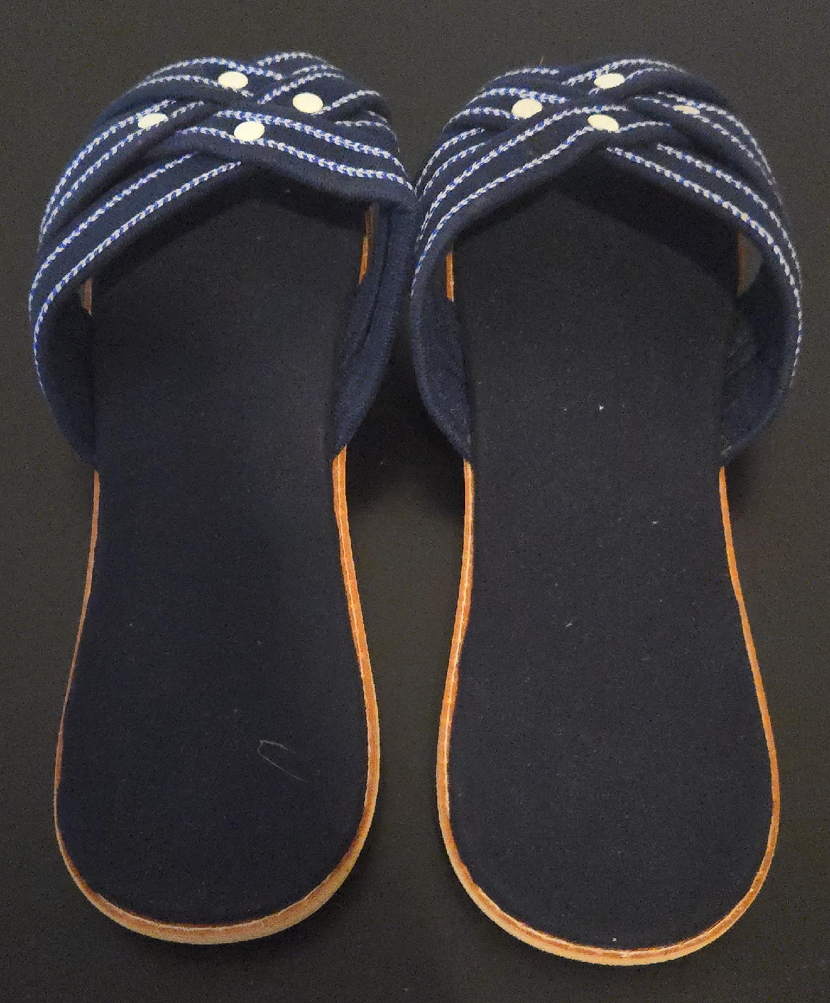 342Here are some comfy navy blue slippers! They have a cute striped design on the top and are in great condition. Perfect for wearing around the house