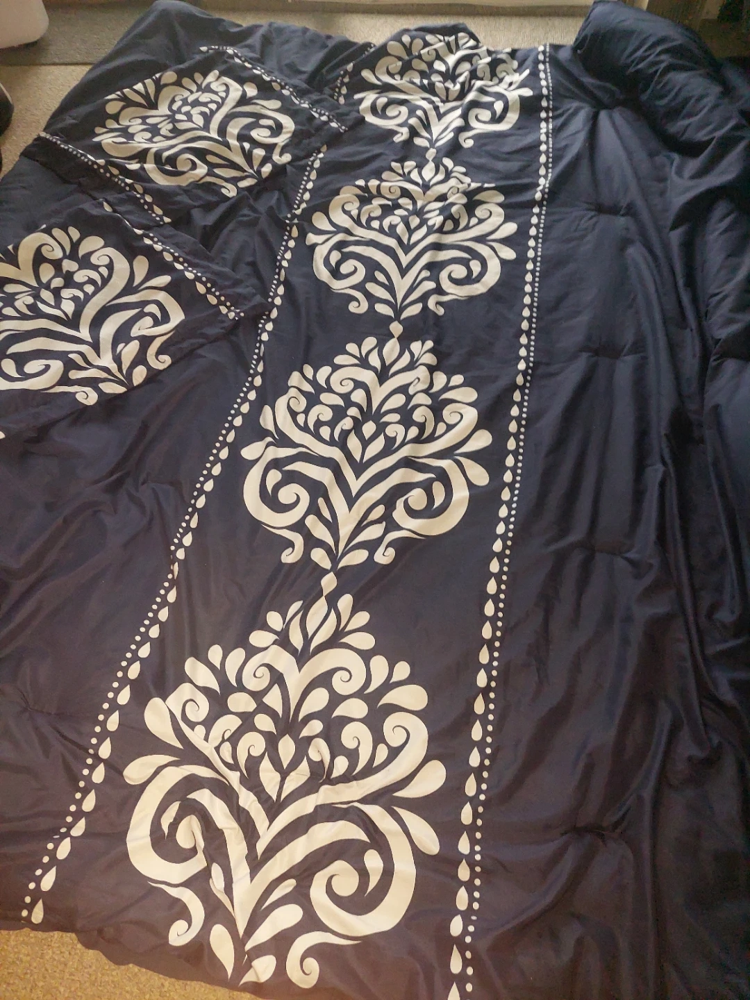 135Selling a beautiful navy blue and white comforter set! It features a lovely damask pattern. Perfect for adding a touch of elegance to your bedroom. The reverse is solid navy blue. Perfect for King size bed or Queen. It's very warm and fluffy.