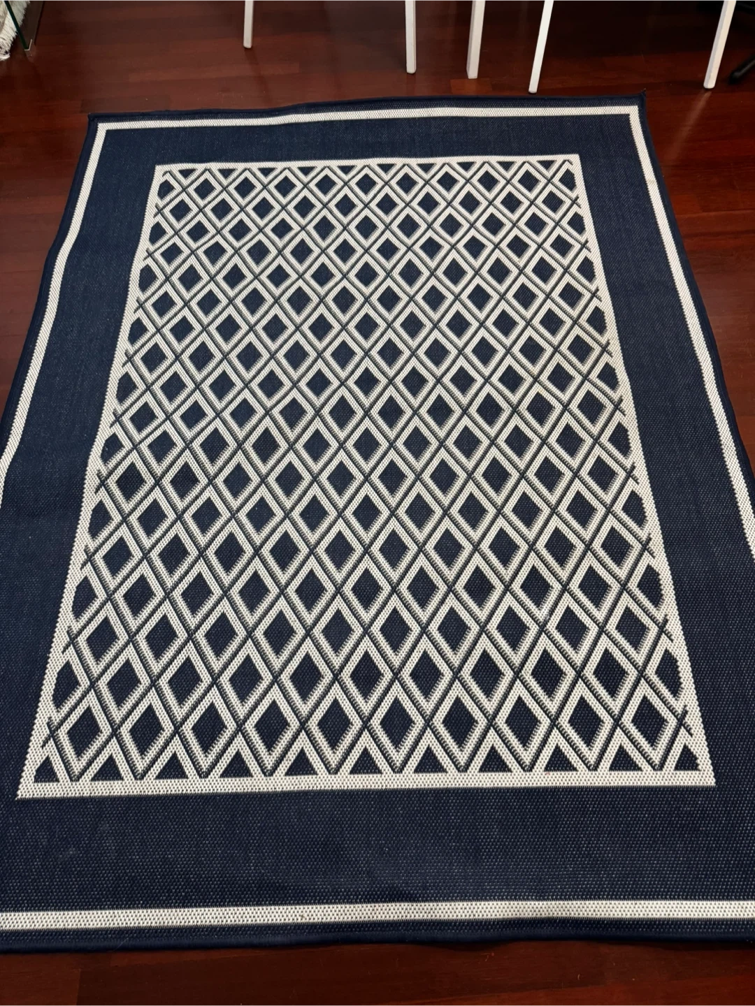 This is a nice area rug with a navy and white geometric pattern. It would look great in any room of the house! 80x62 inches Like new $40 Yonge and finch area