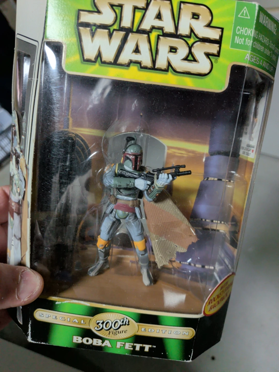 This is a Star Wars Boba Fett action figure, a special 300th figure edition. It comes in its original packaging.