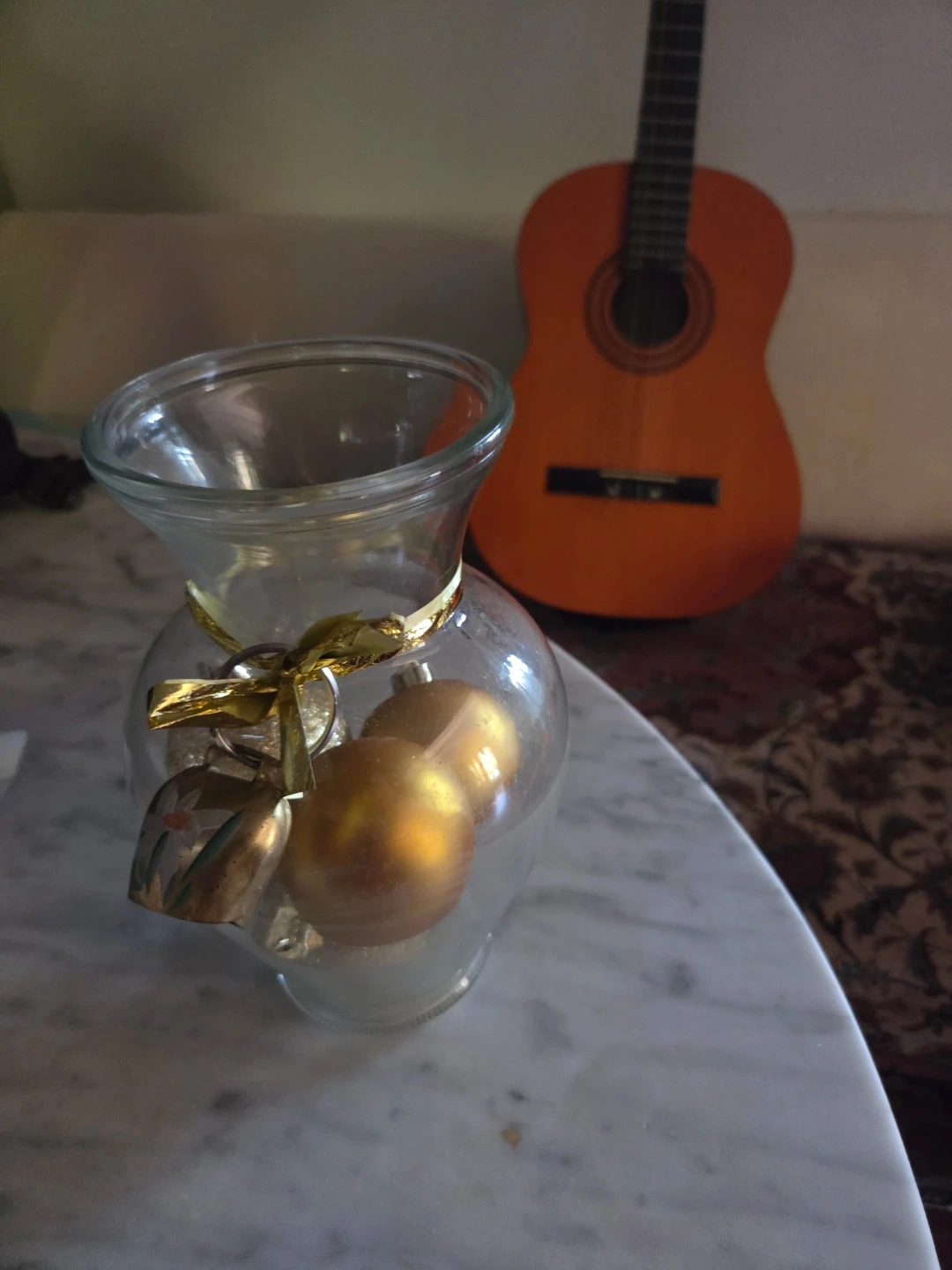 Clear glass vase with a gold ribbon tied around the neck. It's filled with gold and silver Christmas ornaments. A decorative bell is also attached to the ribbon. Perfect for holiday decor!