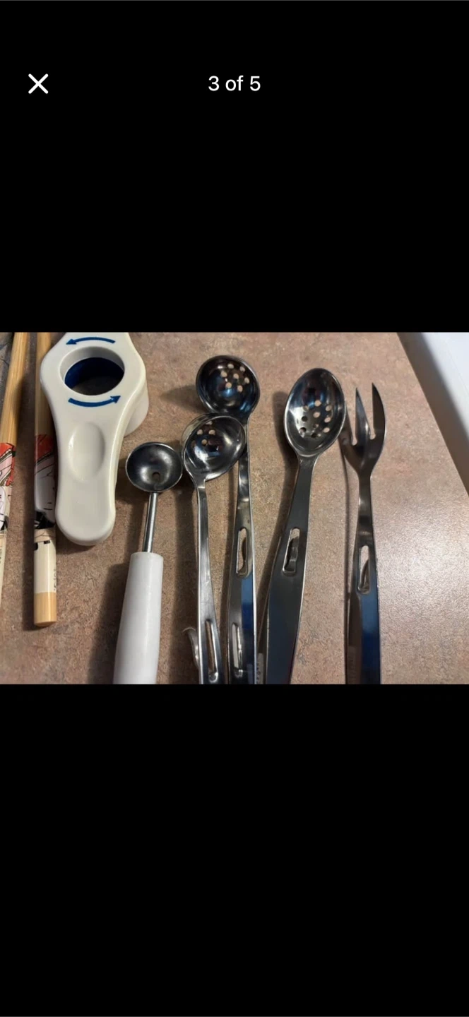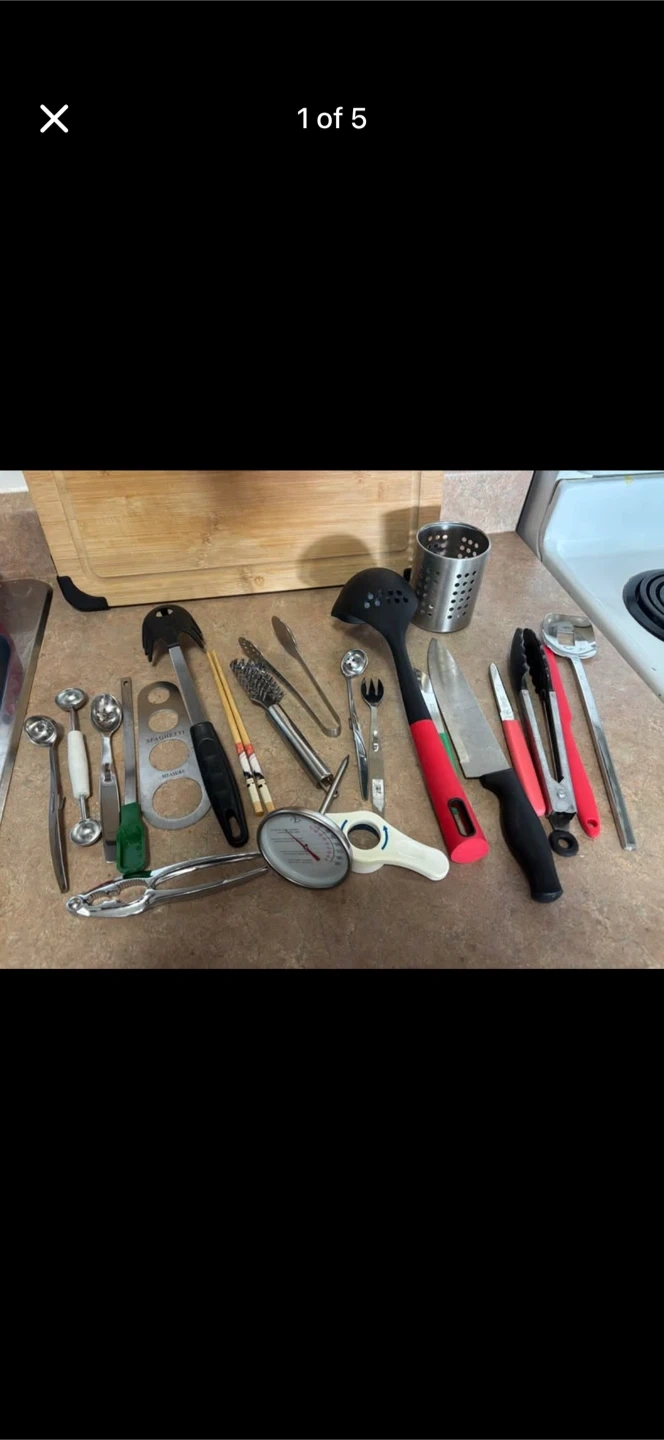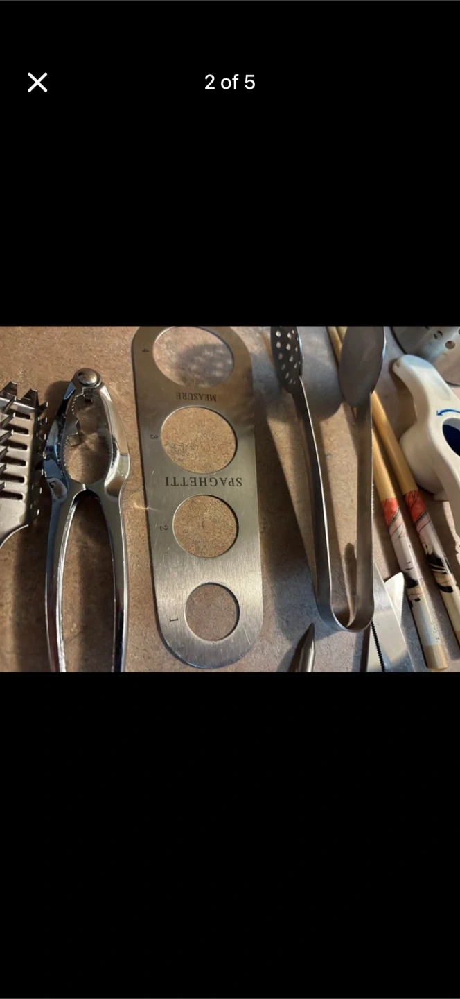 Assorted kitchen tools including a spaghetti measurer, nutcracker, and thermometer. Includes various tongs, spoons, and a knife. A helpful collection for any kitchen!smoke free pet free home . pick up 551 Emerson street .Cash only .no delivery. No e-transfer.