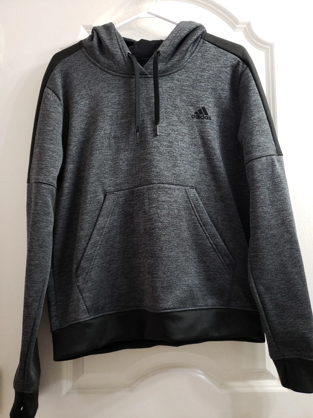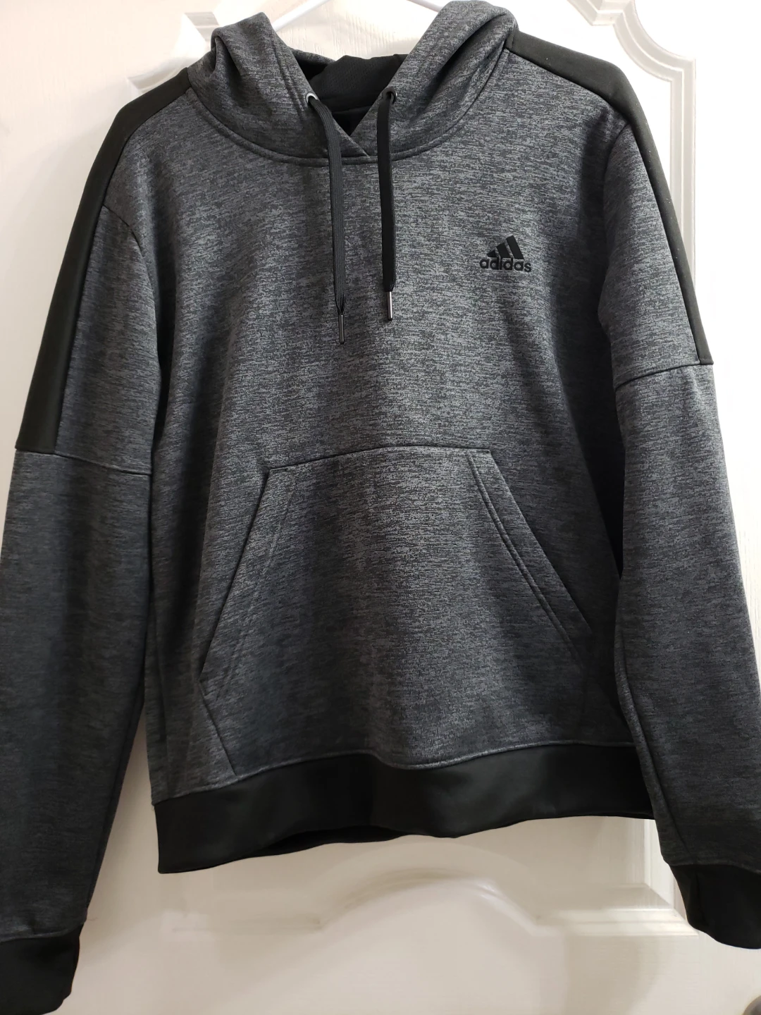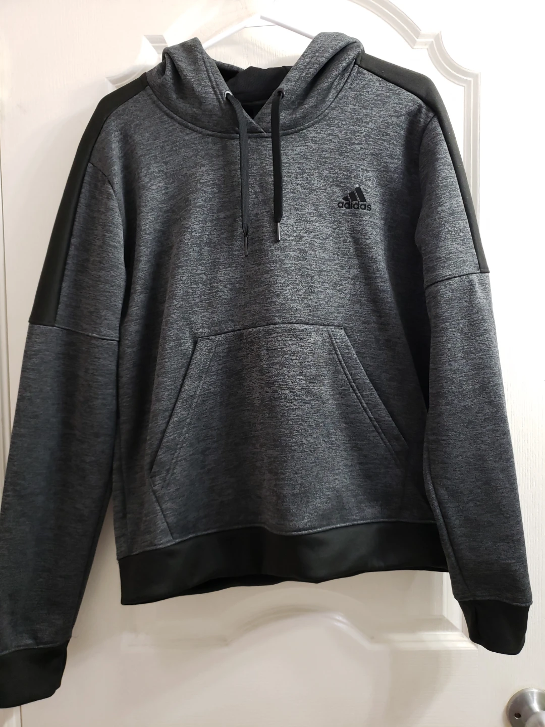 Grey Adidas hoodie with a front pocket. Made with a polyester and cotton blend. It's a size L.Unisex