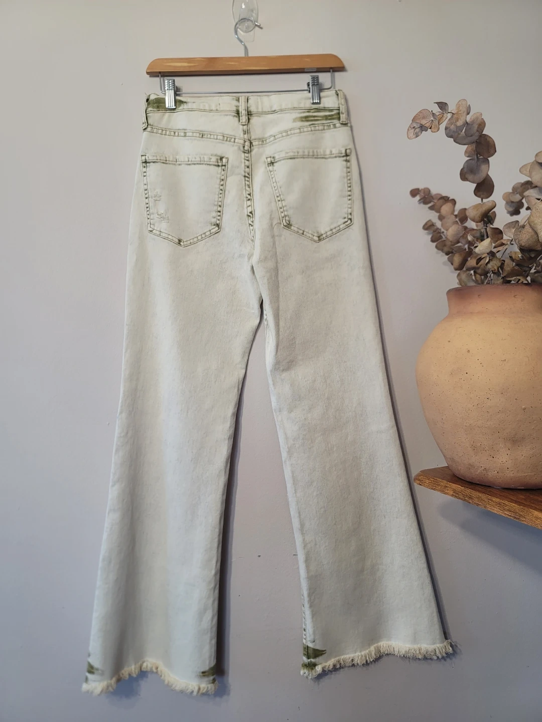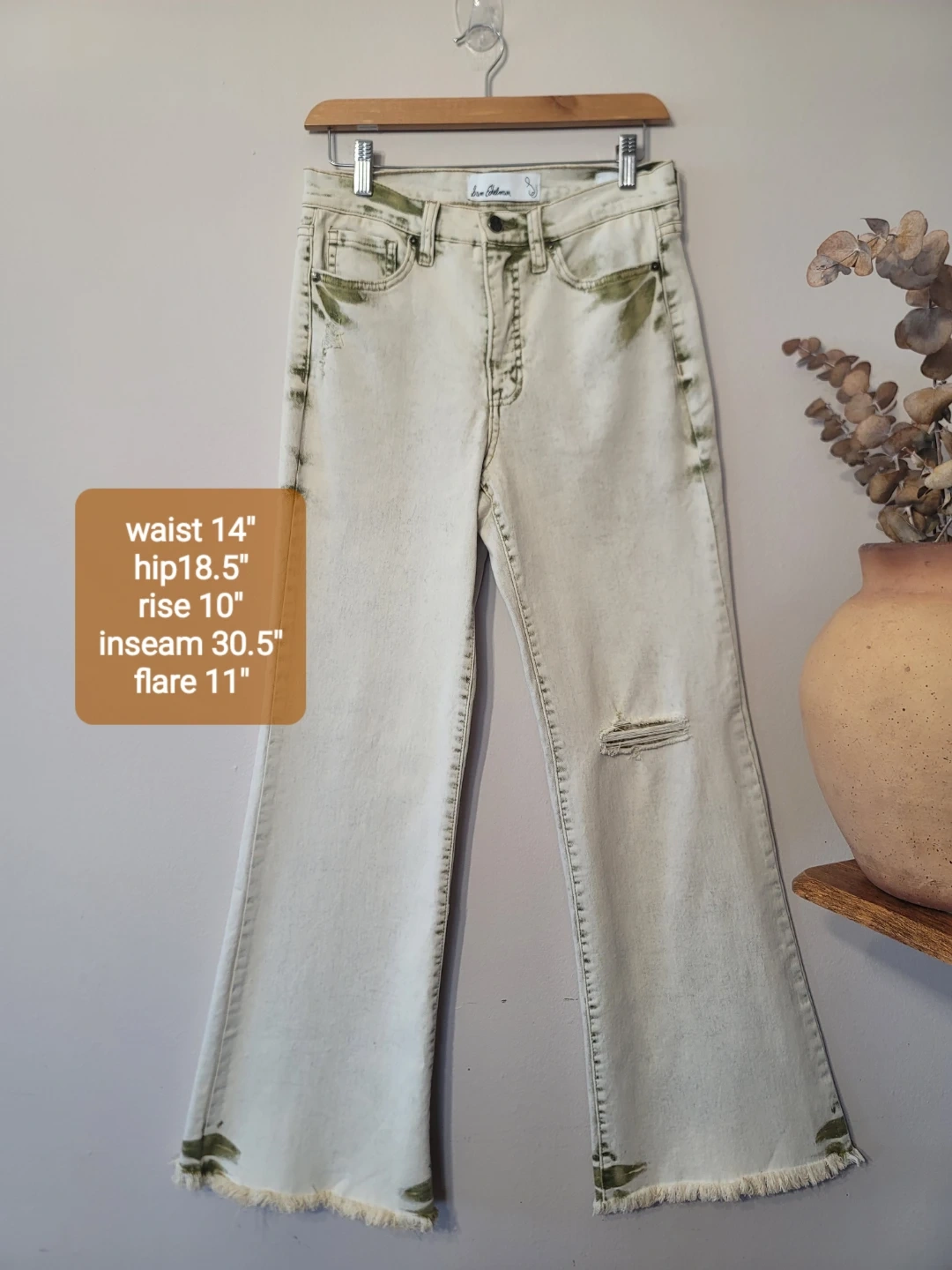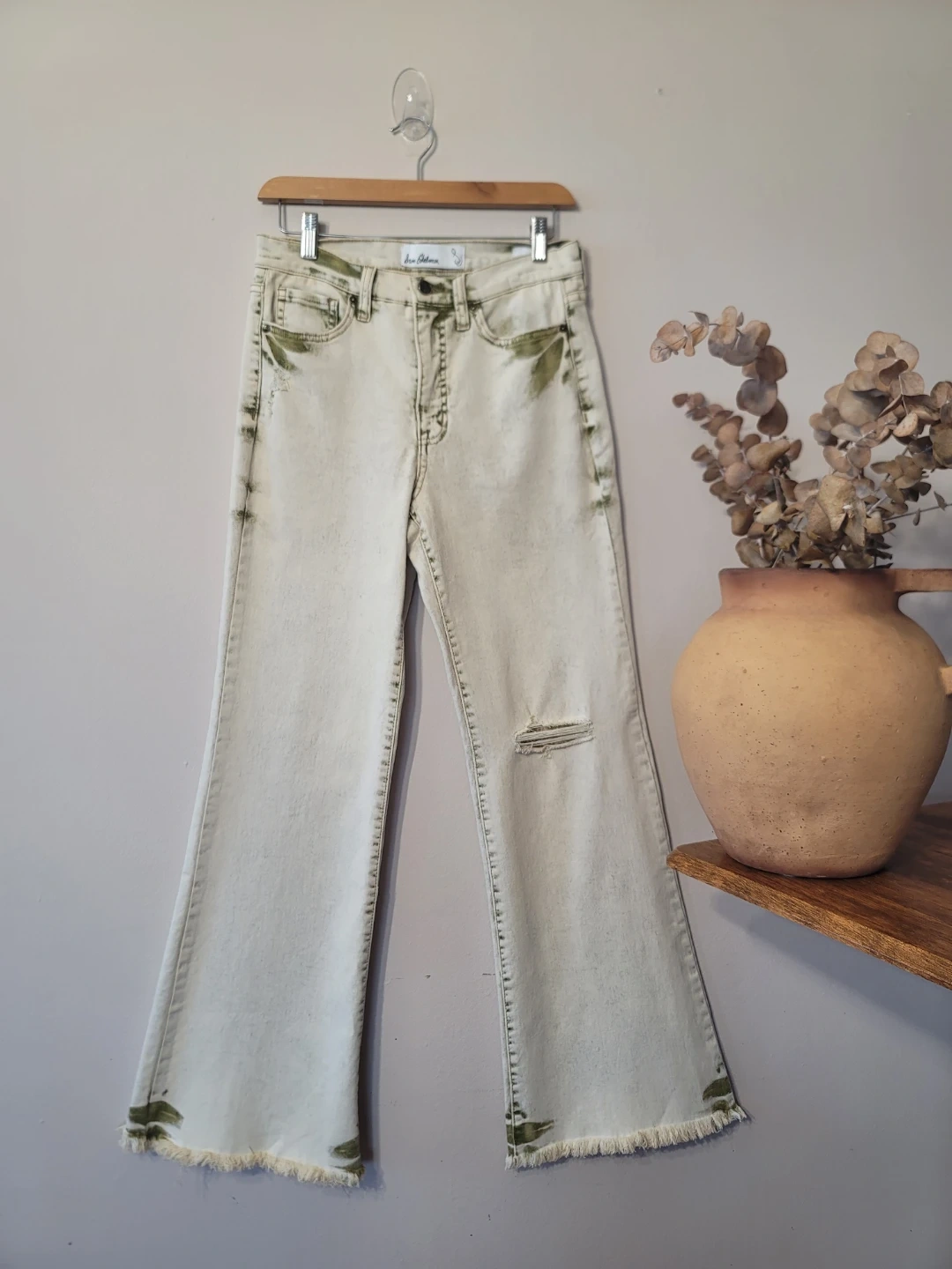 Elevate your rotation with these Sam Edelman high-rise flare jeans. Featuring a unique moss green and sand colorway, these are giving major earthy boho meets grunge sleaze vibes. The distressed details and raw, frayed hem add that perfect "lived-in" edge for a curated, vintage-inspired look. Designer