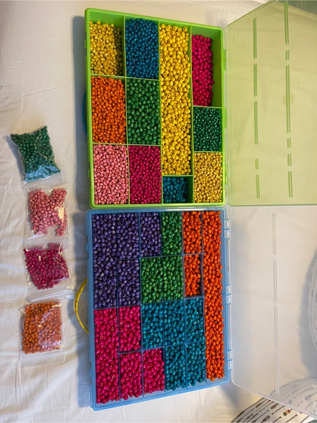 A large assortment of colourful wooden beads for crafting projects. Includes multiple colours like green, pink, orange, purple, blue, and yellow. Comes in two storage containers with various compartments for organization.