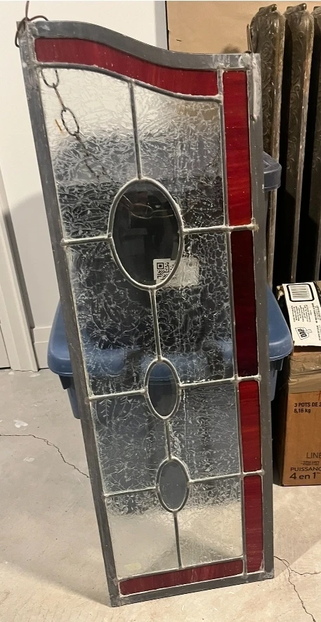 This decorative stained glass panel features clear textured glass with a wavy edge and red glass accents. It has a dark metal frame and three oval dark glass inserts. It's ready to add a touch of vintage charm to your home!