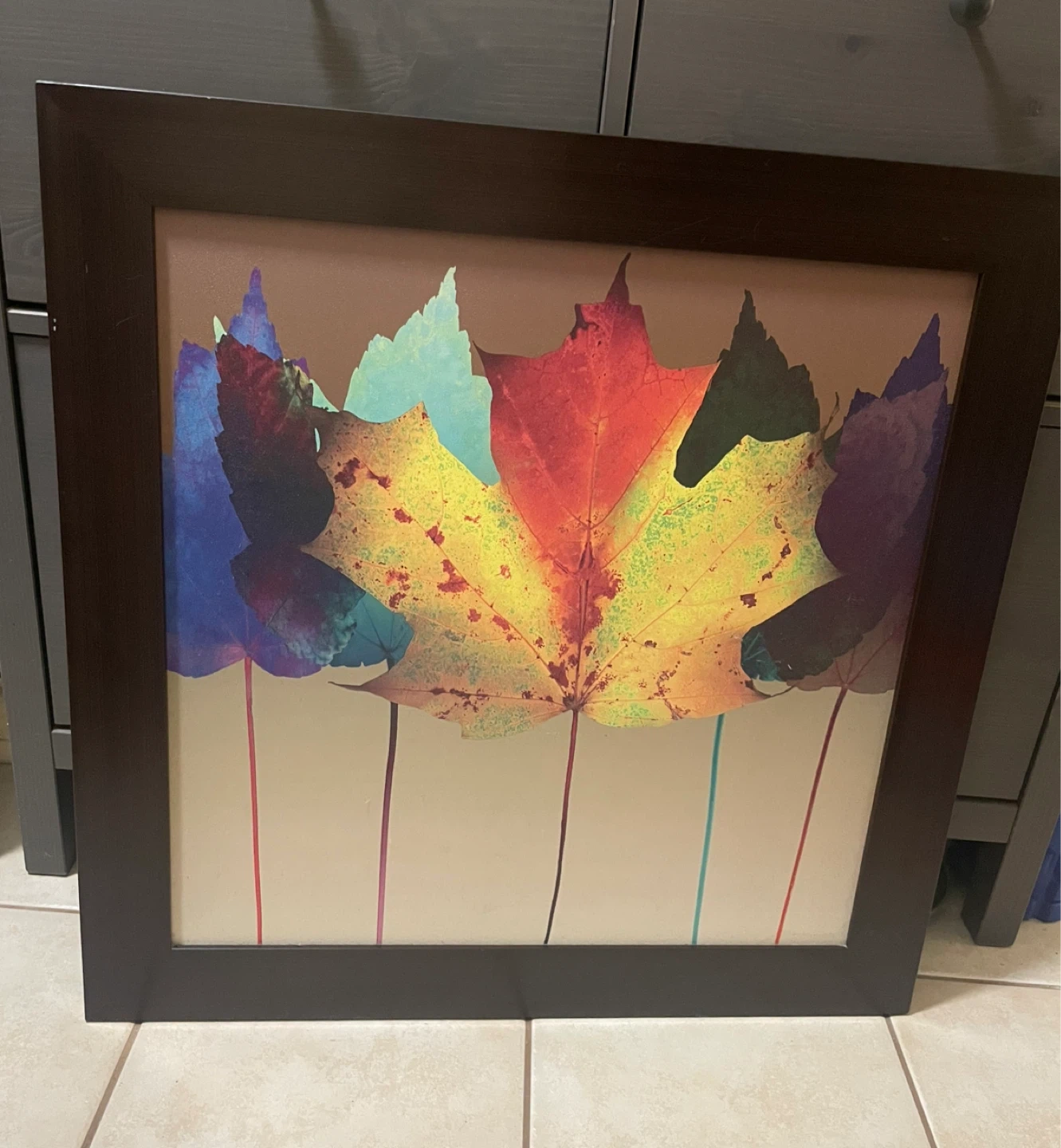 “Leaf Dance” by Robert Mertens. Beautiful vivid colours with a dark brown frame — in excellent condition and comes ready to hang. Originally purchased for $$$. Dimensions: 29 x 29”