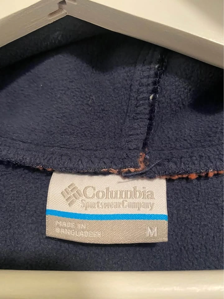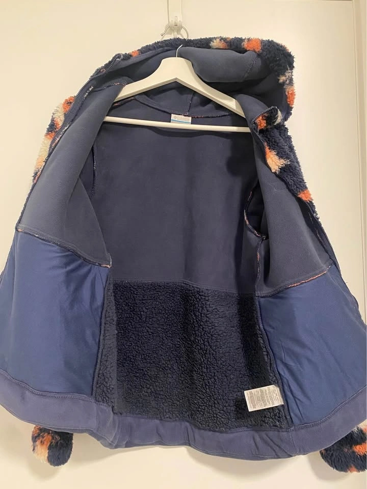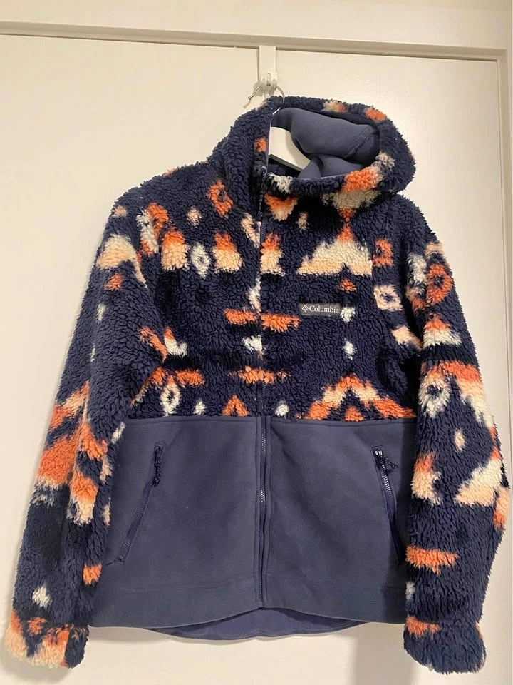 Never worn. Columbia Winter Pass Hooded Full Zip Sherpa fleece jacket in navy with a pattern. Pick up near Oakridge 41st Skytrain station. Feel free to ask any questions.