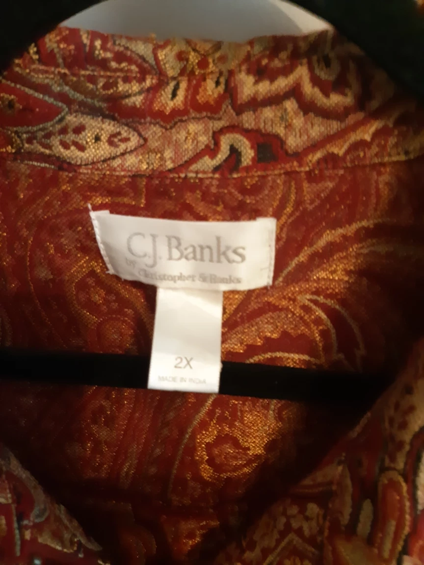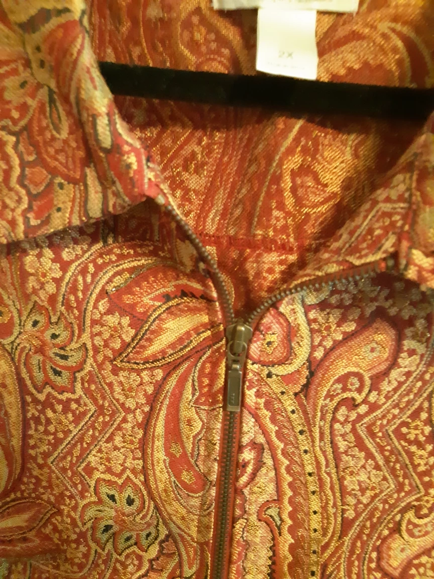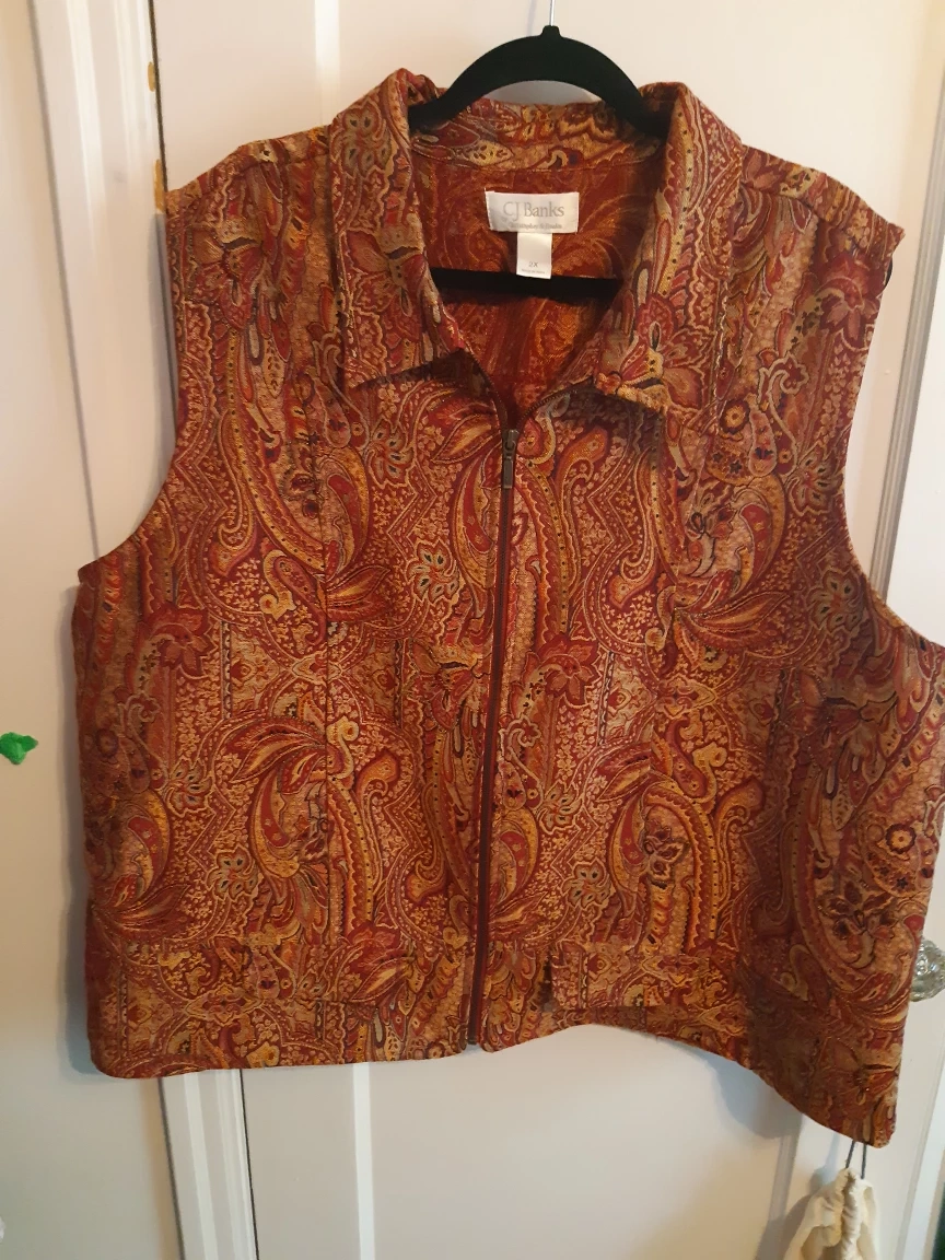 Selling a gently used CJ Banks vest in size 2X! It features a beautiful paisley pattern in shades of red and gold. The vest has a full zipper closure and is made in India. Perfect for adding a touch of elegance to any outfit!