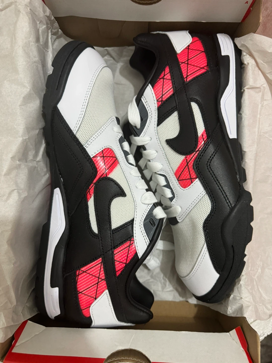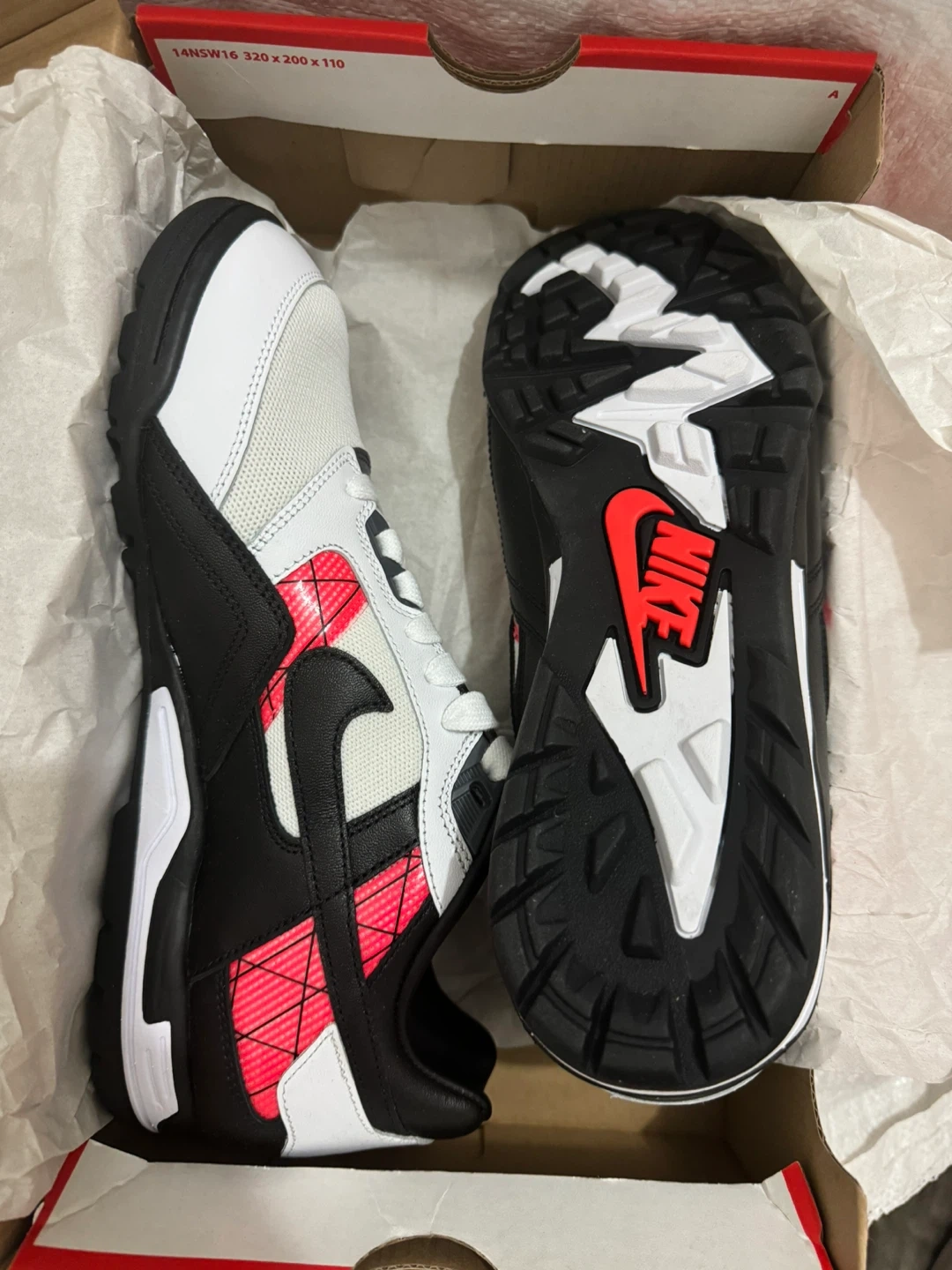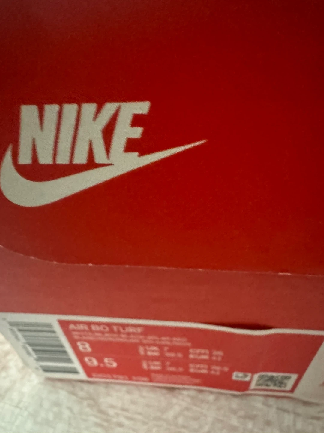 These Nike Air sneakers are a men's size 8. They feature a white, black, and red design. Includes original box.
