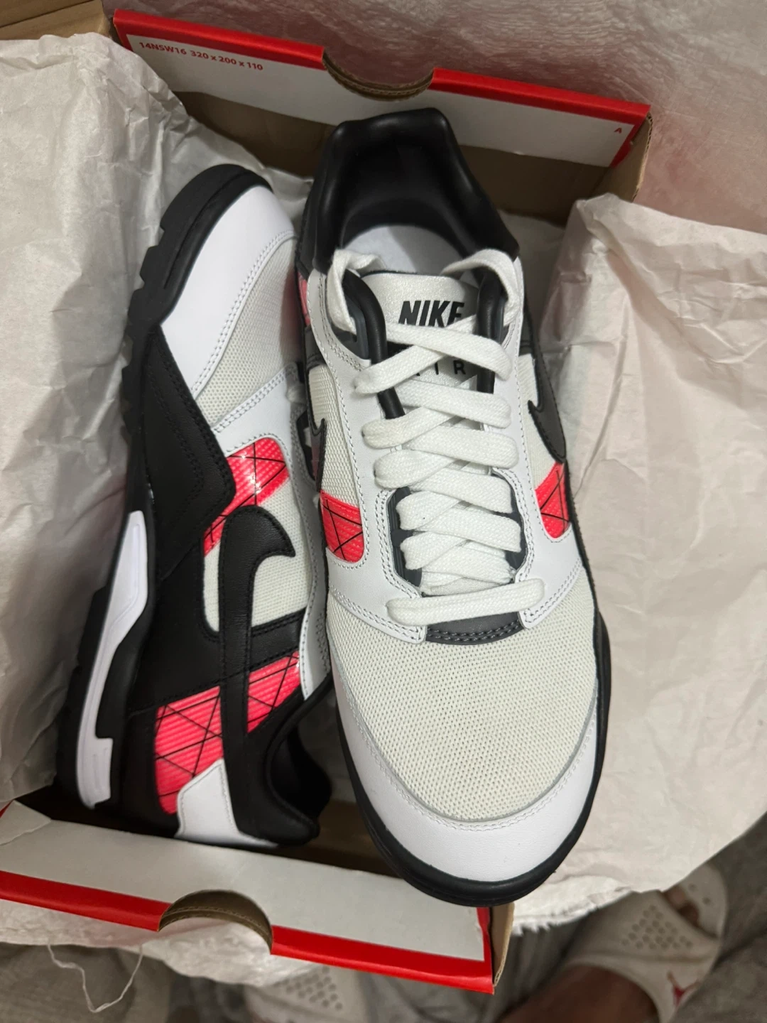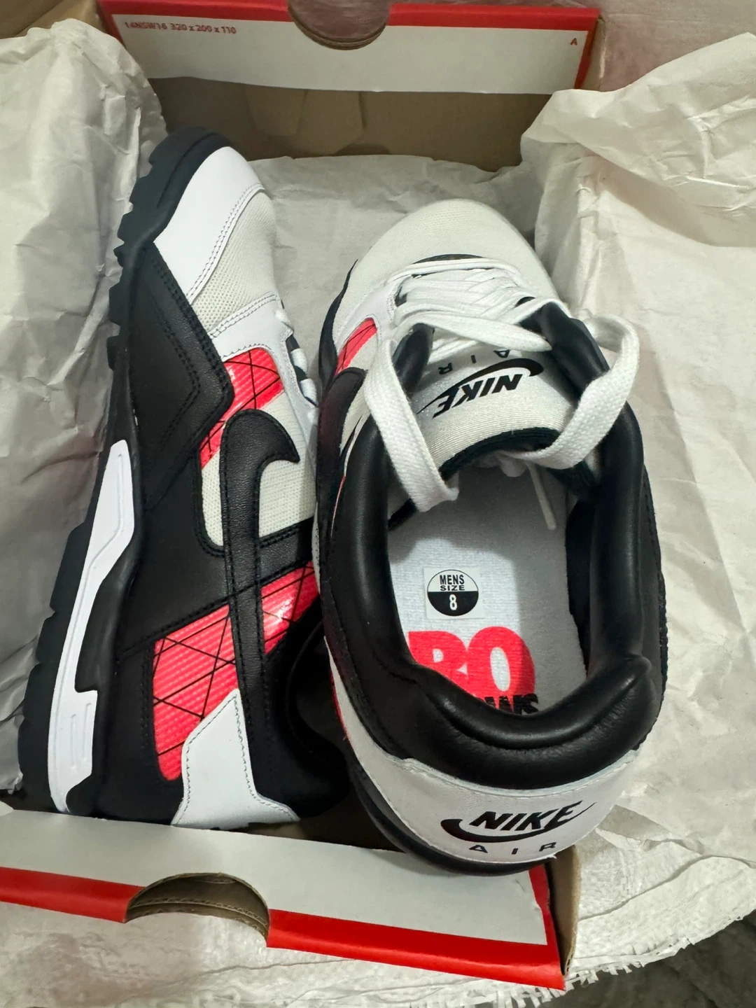 These Nike Air sneakers are a men's size 8. They feature a white, black, and red design. Includes original box.