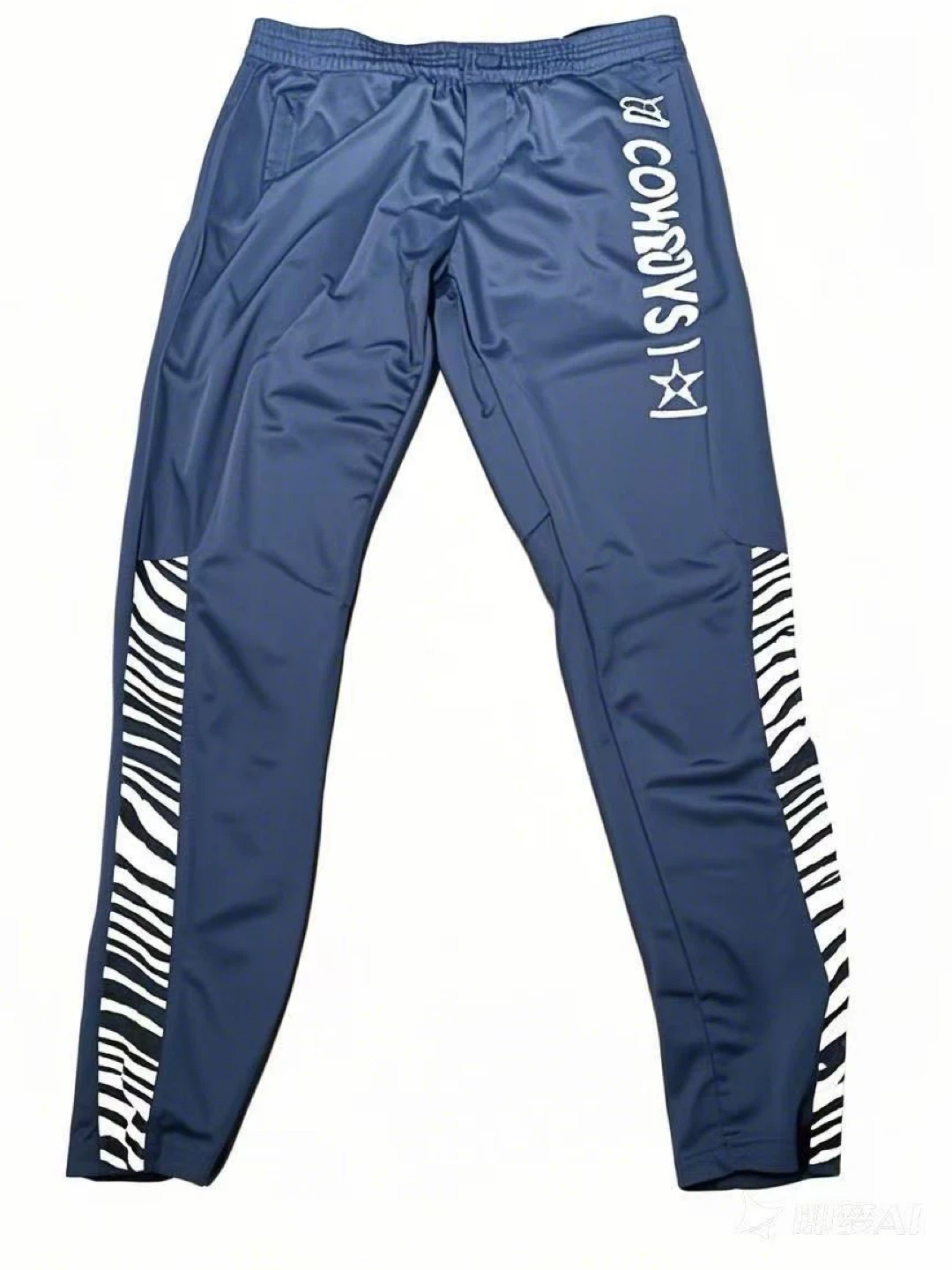 Blue Dallas Cowboys NFL tracksuit set. Track pants feature 'Cowboys' text and zebra print accents. Hoodie has a blue and white design with the Cowboys star logo and NFL emblem.