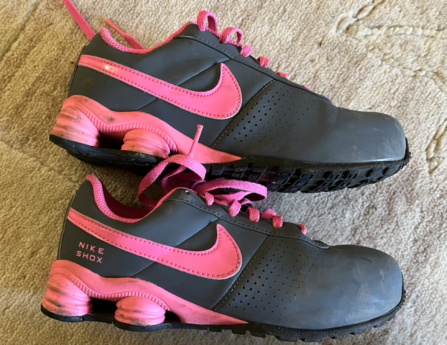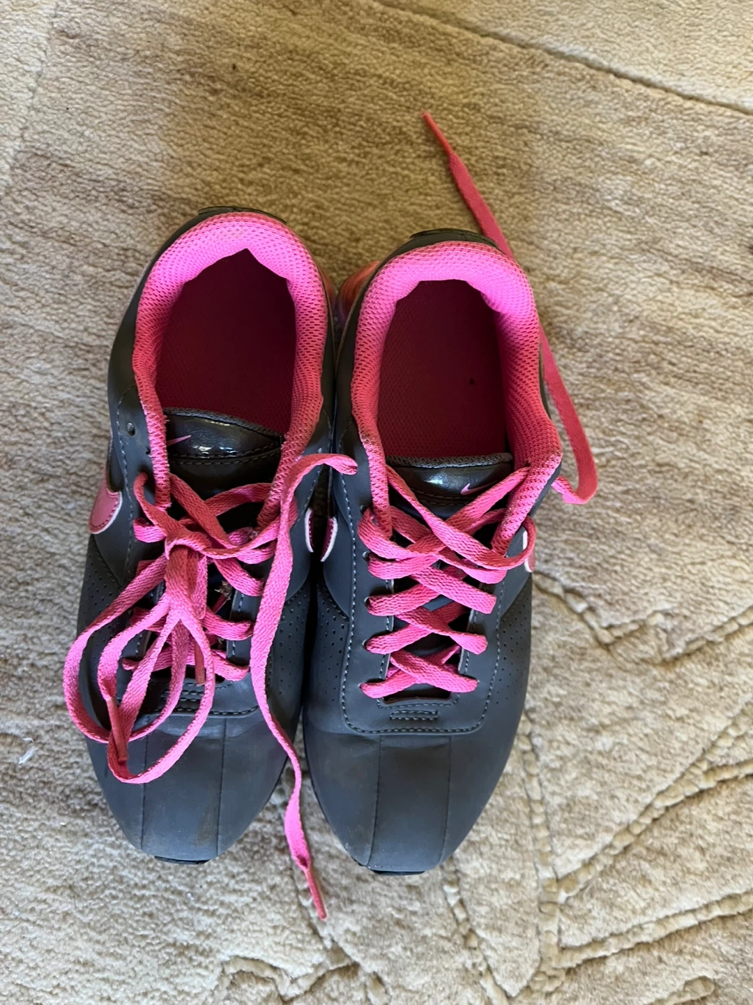 Selling a pair of Nike Shox in youth size 1 They are grey with pink accents and in good condition. The shoes feature the iconic Nike swoosh and Shox technology for cushioning and style