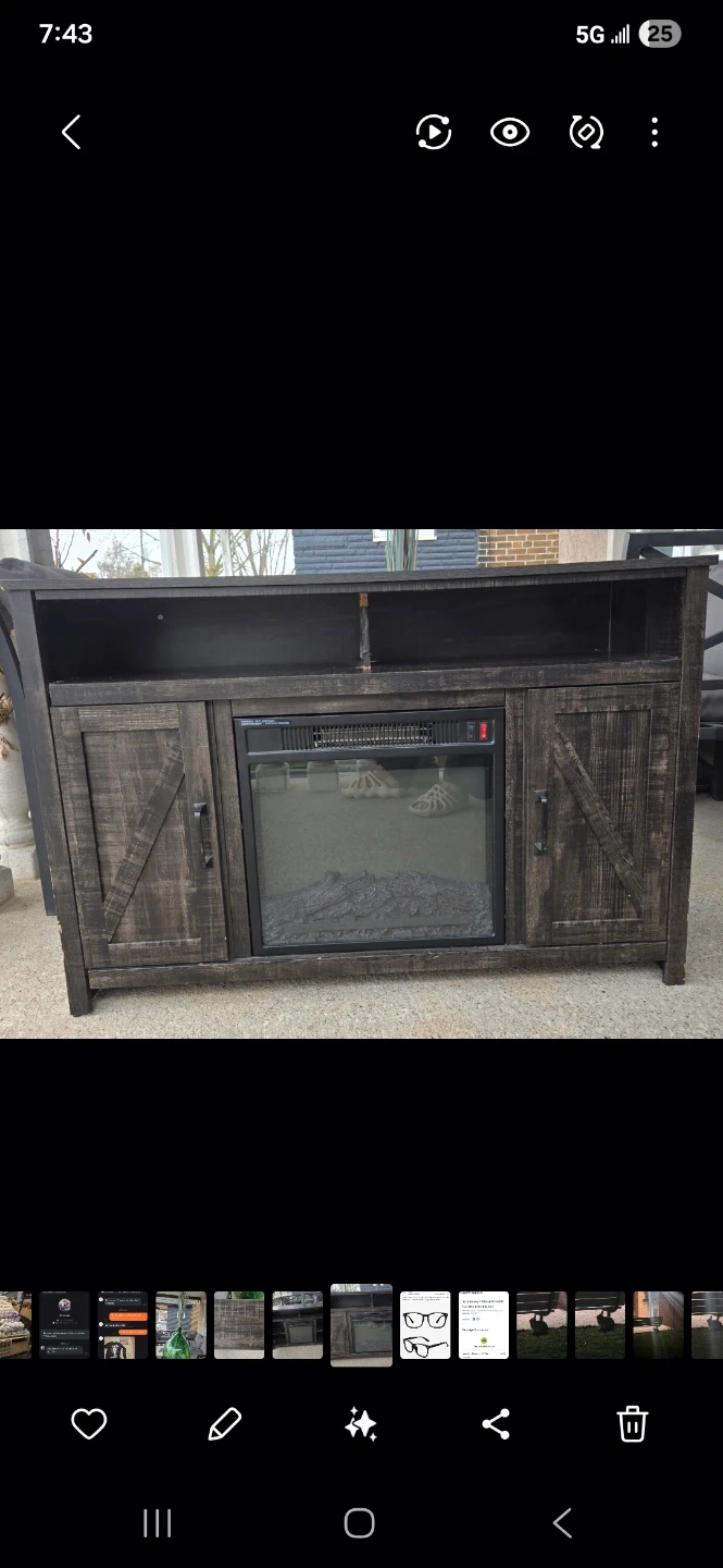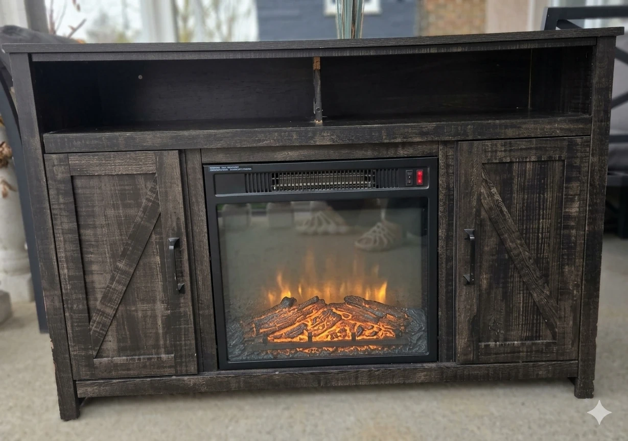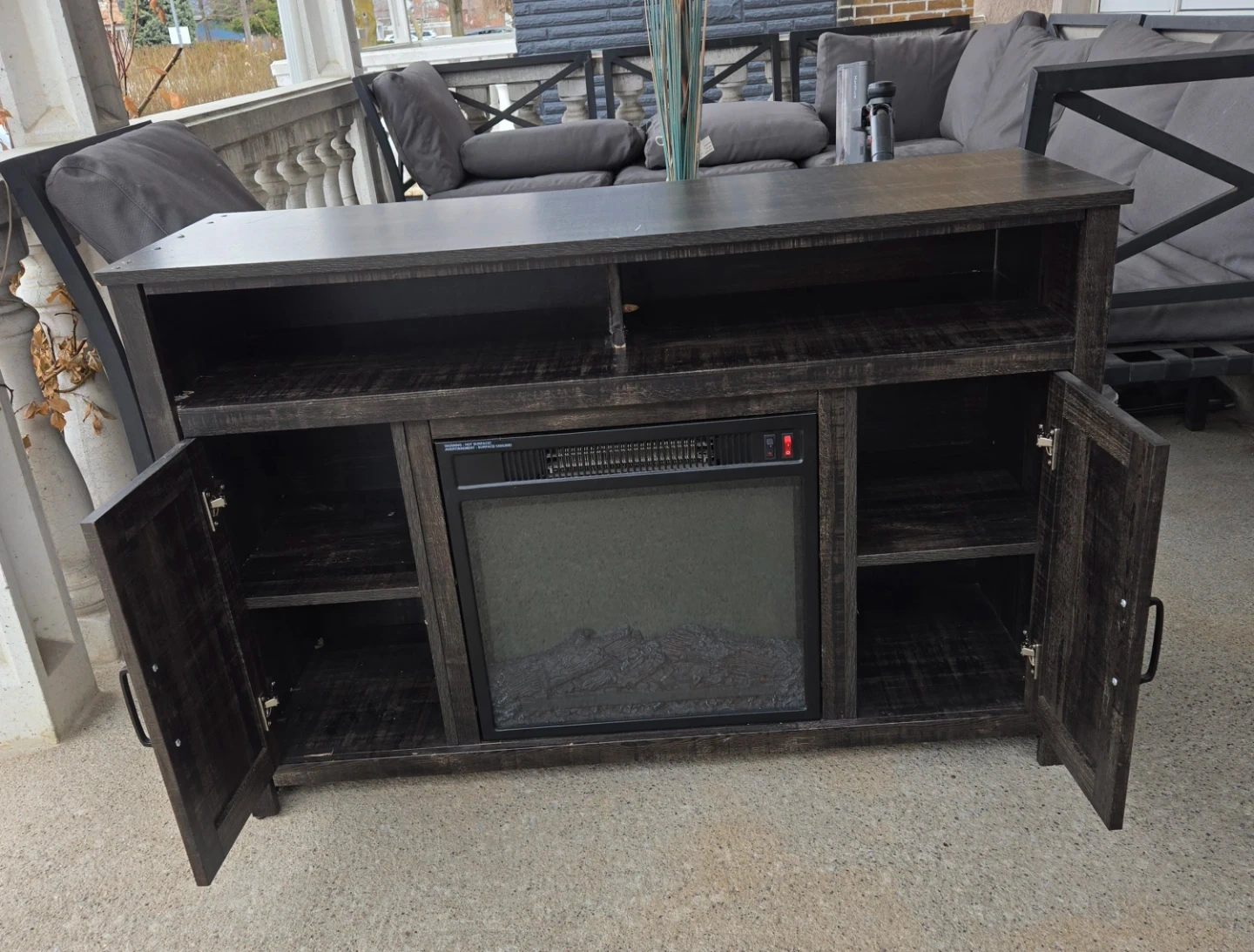 Dark wood TV stand with a built-in electric fireplace. It features two cabinet doors on either side and an open shelf above the fireplace. The fireplace has realistic flame effects and a heating element.