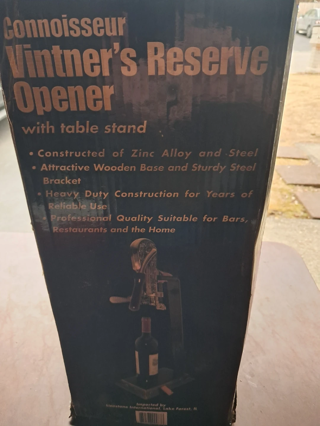 This Connoisseur Vintner's Reserve Opener comes with a table stand. Constructed of Zinc Alloy and Steel with an attractive wooden base and sturdy steel bracket. It's heavy-duty construction ensures years of reliable use. Professional quality suitable for bars, restaurants, and the home!