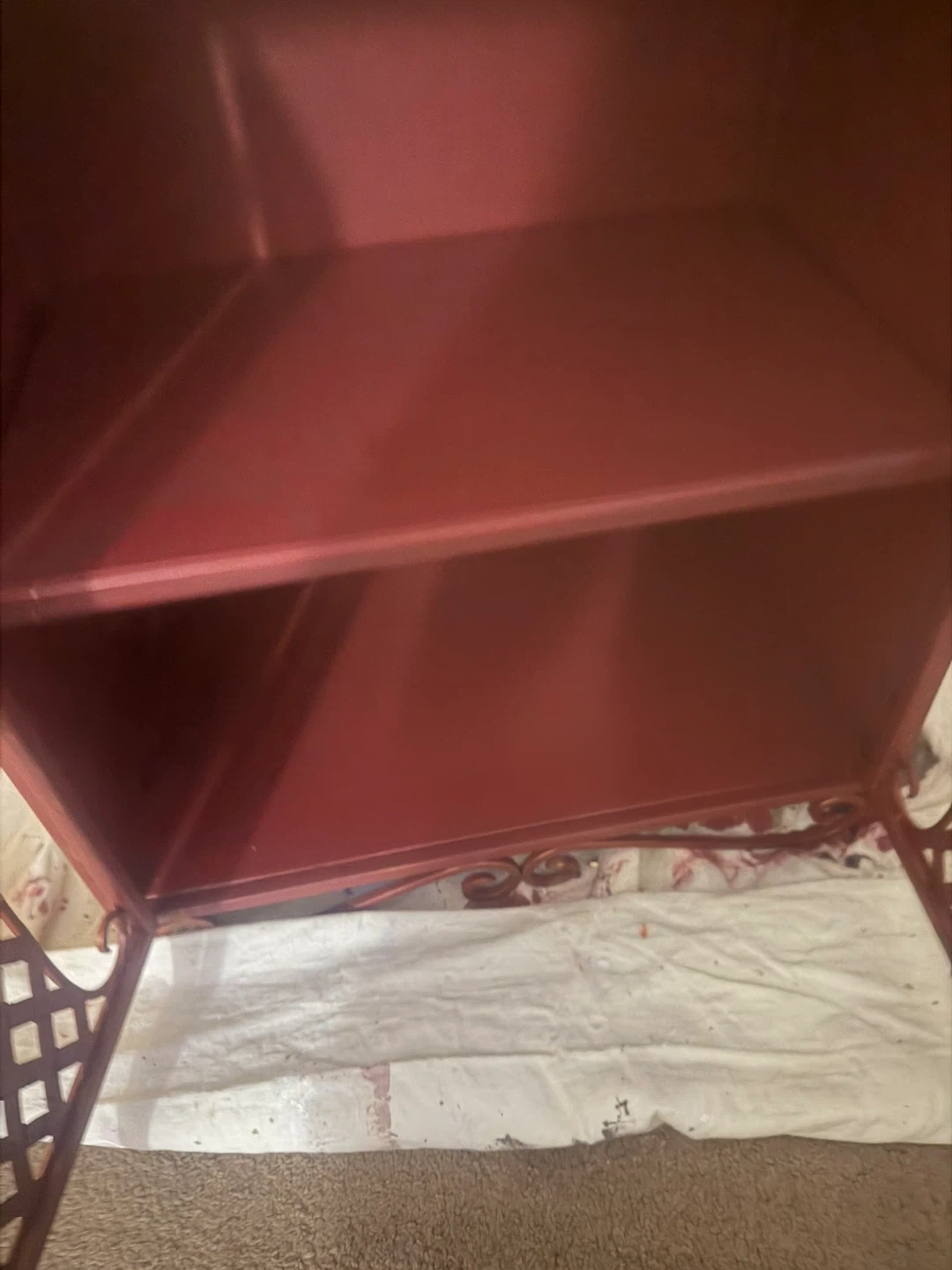 This charming side table features a deep red finish with ornate gold accents. It includes two drawers and a cabinet with decorative lattice doors, perfect for storage. The artwork on the front adds a touch of vintage elegance.