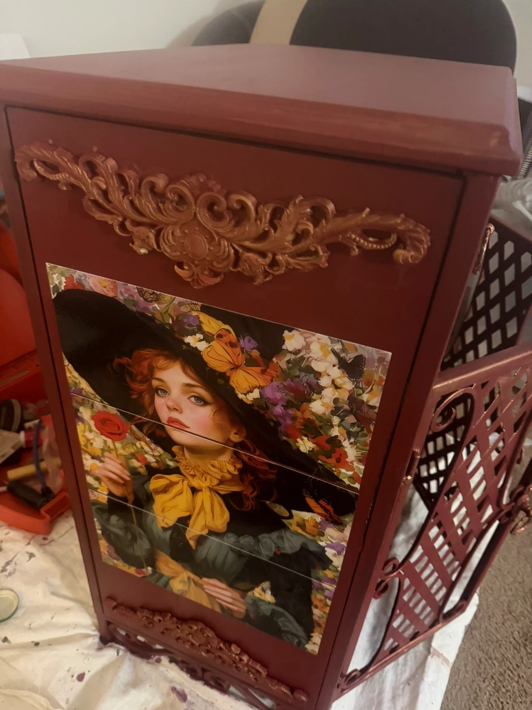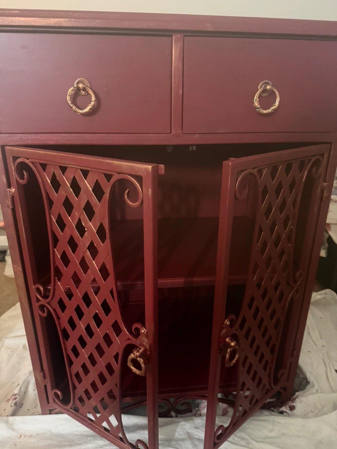 This charming side table features a deep red finish with ornate gold accents. It includes two drawers and a cabinet with decorative lattice doors, perfect for storage. The artwork on the front adds a touch of vintage elegance.