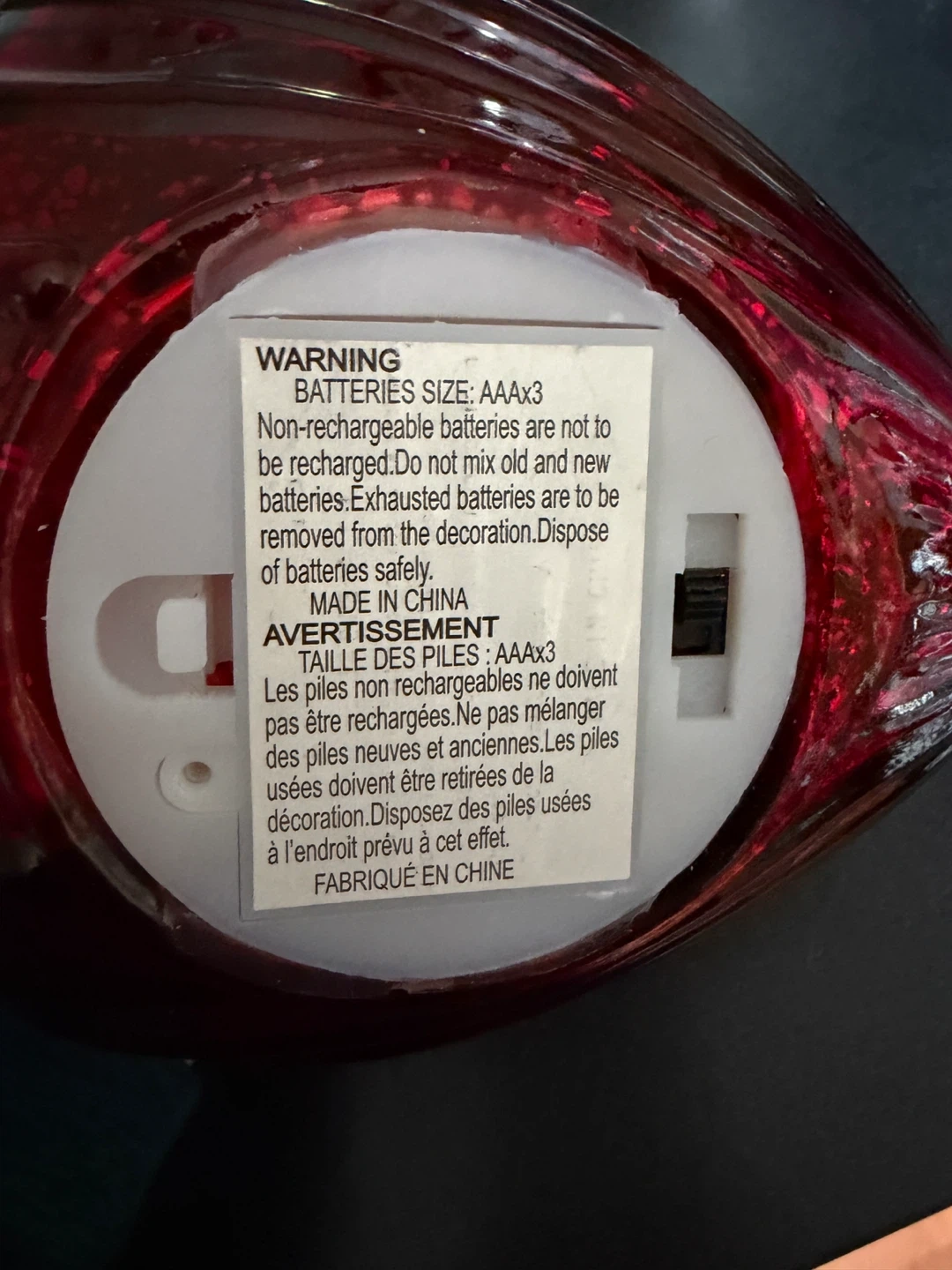 Barely used red crackled glass table ornament with internal LED light. Add a touch of festive charm to your space with this Allen + Roth tabletop decoration! It's a beautiful red colour and comes with its original box. Requires AAA x3 batteries.