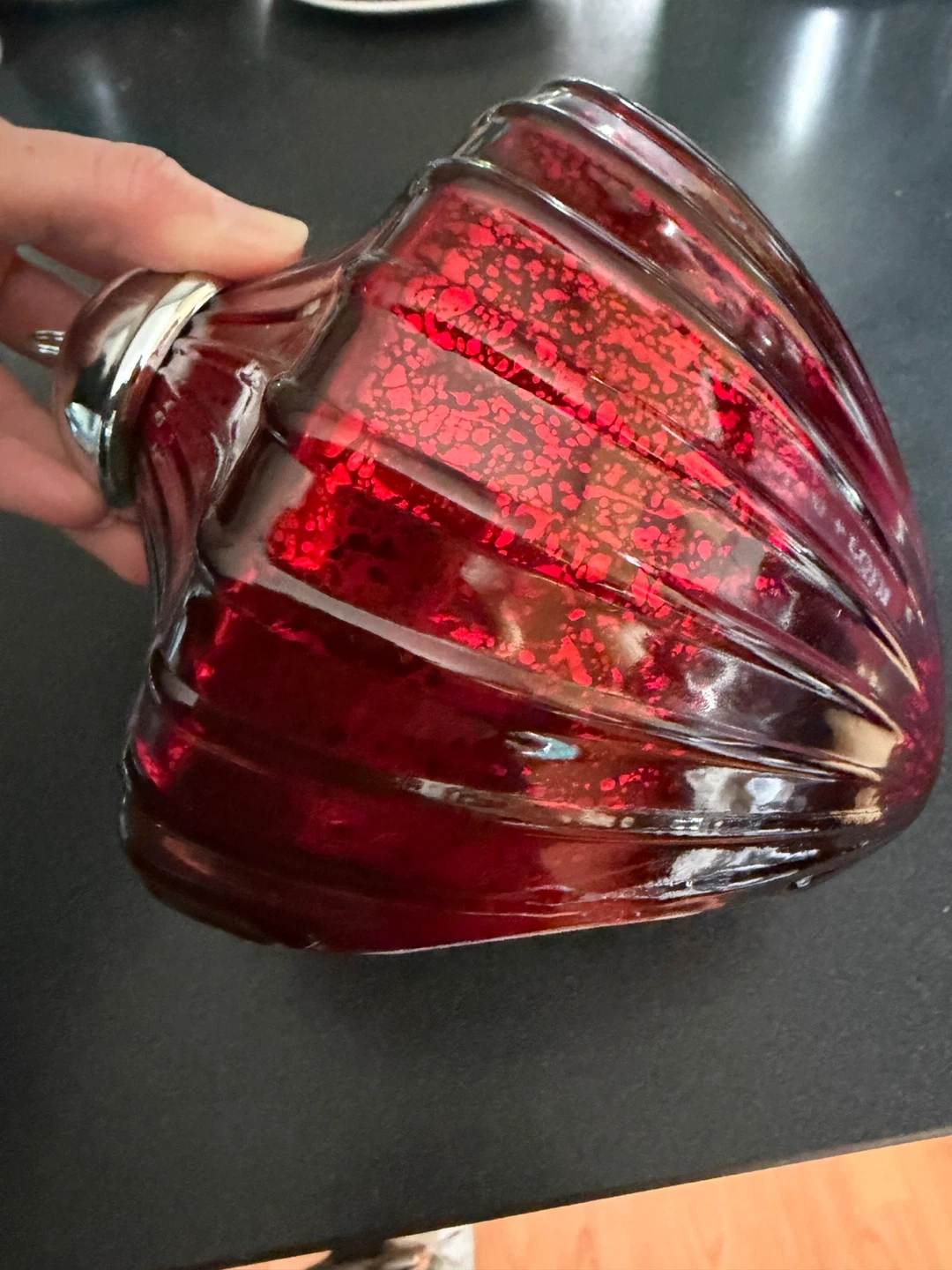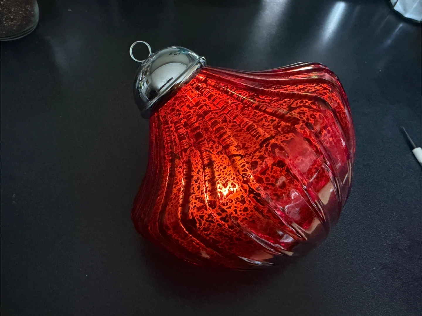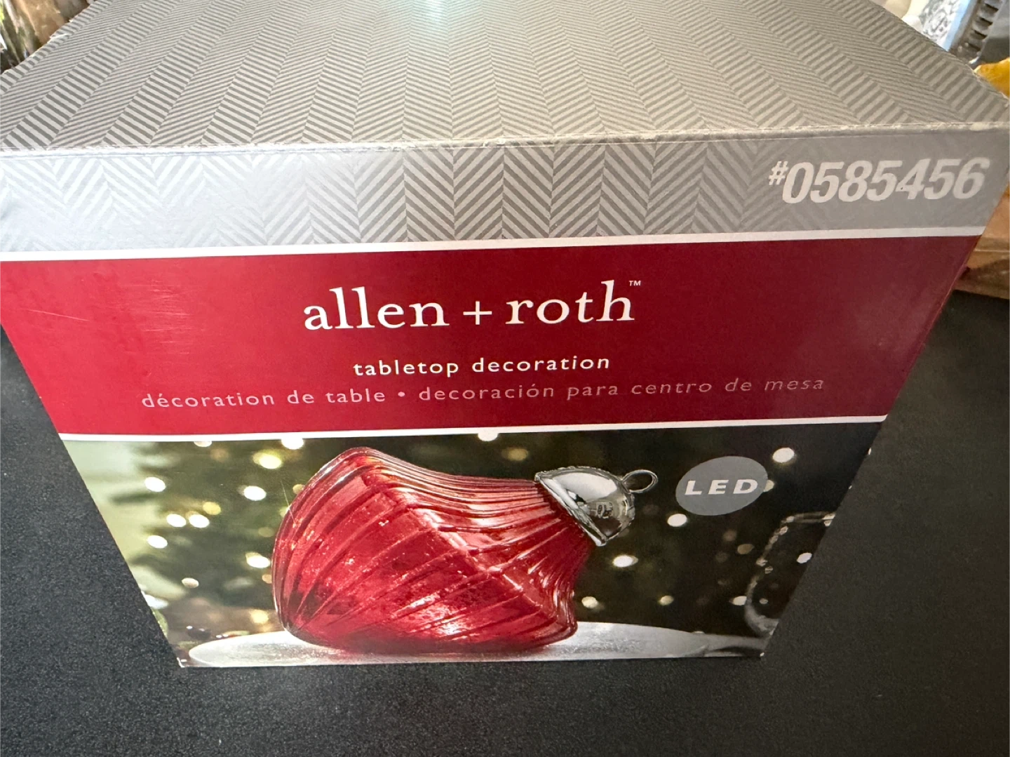 Barely used red crackled glass table ornament with internal LED light. Add a touch of festive charm to your space with this Allen + Roth tabletop decoration! It's a beautiful red colour and comes with its original box. Requires AAA x3 batteries.