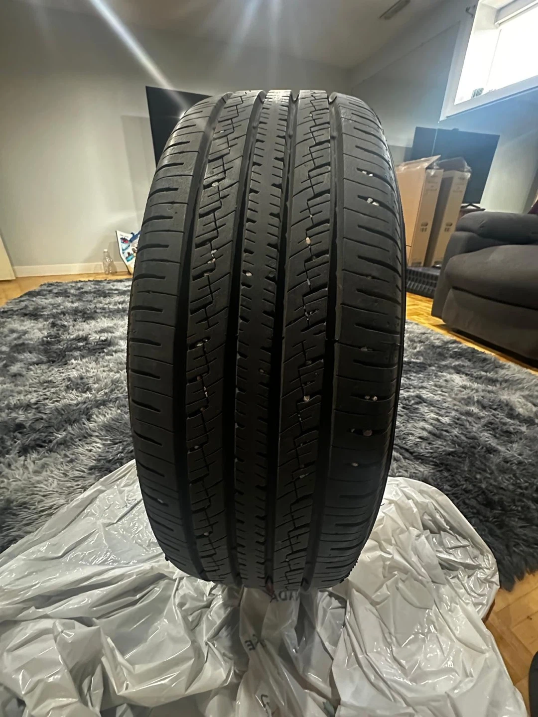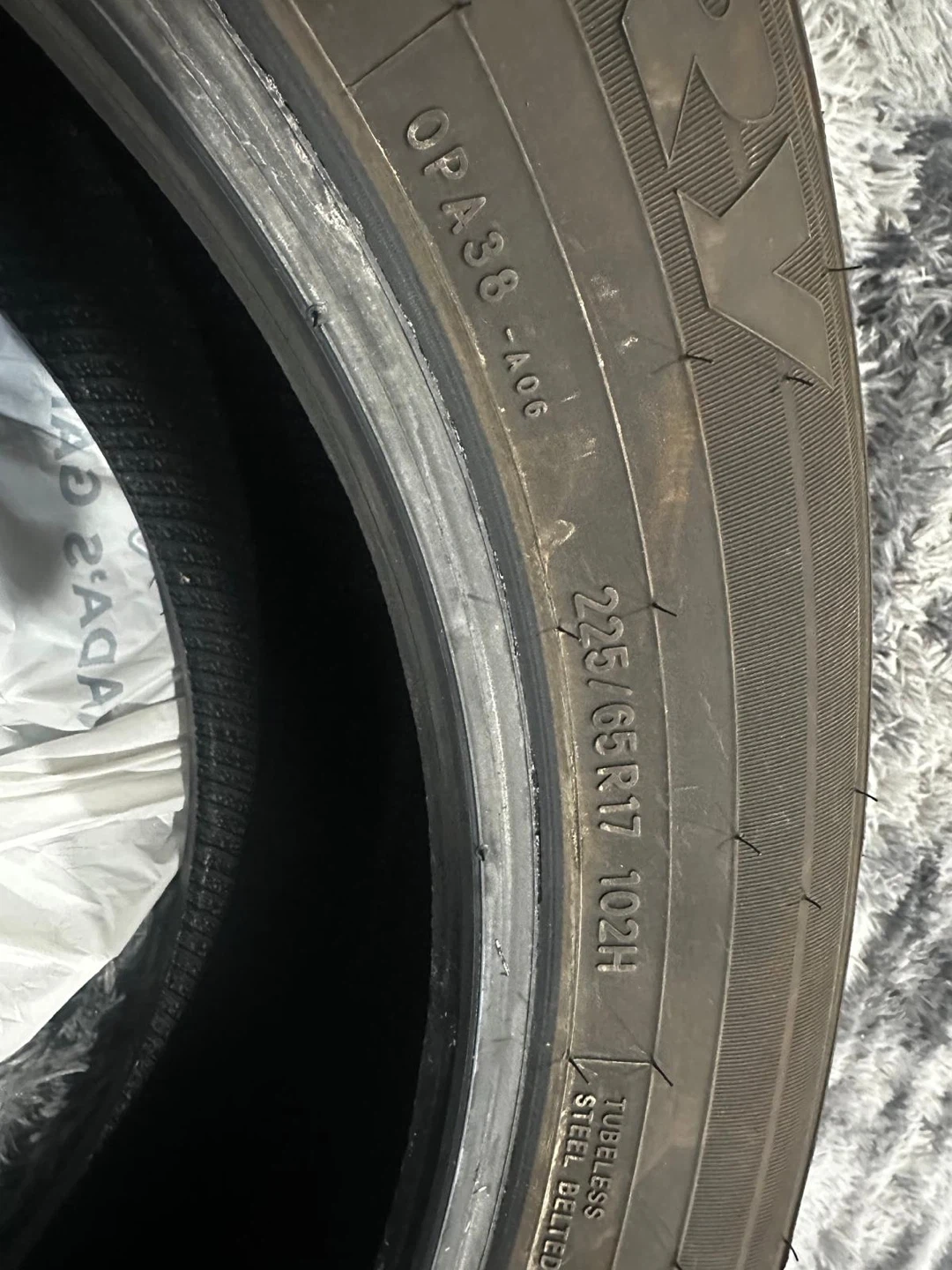 The four tires are Toyota and the prescription is 225 /65R17 102H four tires. They are OK good condition just except one is not good not really good but it can be fixable so but the treat other three tires. They’re in good perfect condition and they are brand new. They are new ones all season.