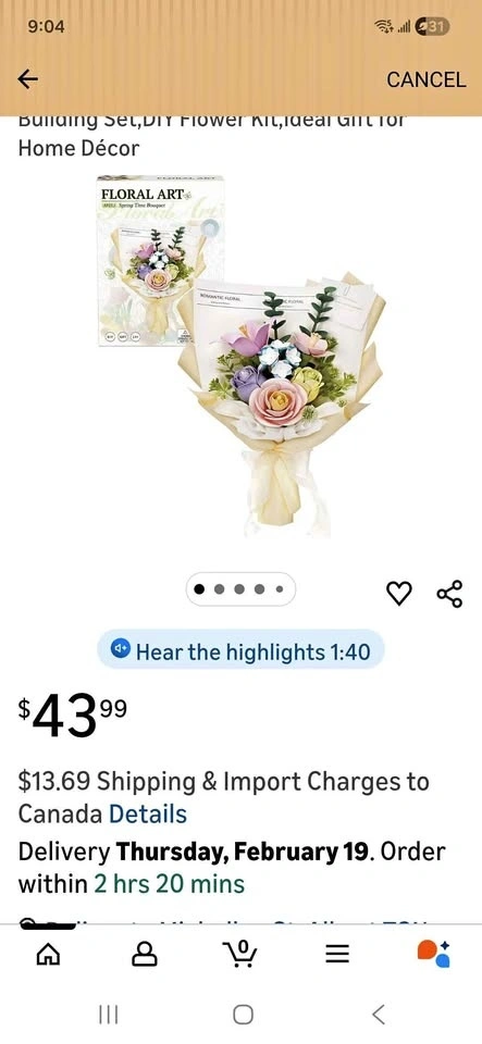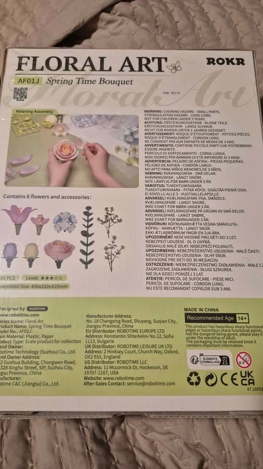 Creative DIY flower building kit. This ROKR Floral Art Spring Time Bouquet is a fun project. It has 6 different flowers and accessories to build. Assembled size is 450x320x420mm. Made with plastic and paper. Great for home decor or a cool gift. Recommended for ages 14+.