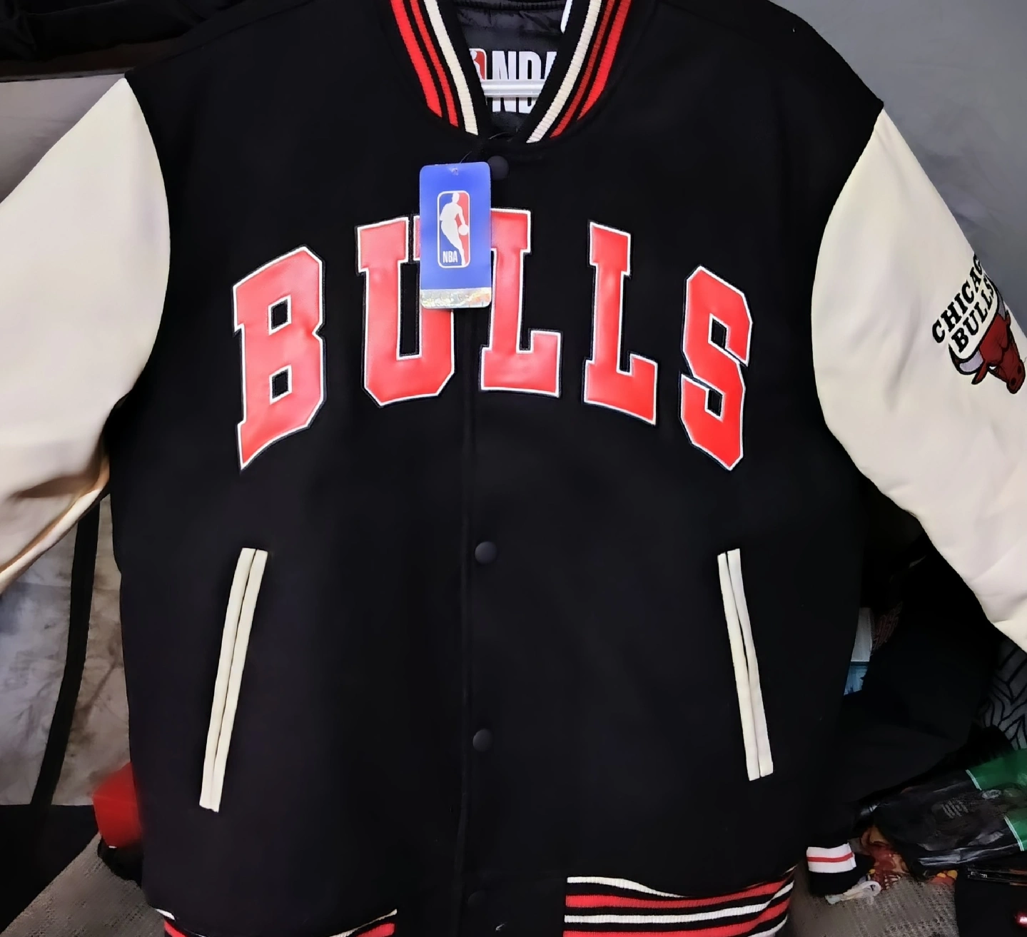Selling a Chicago Bulls varsity jacket! It's black with white sleeves and red accents. The jacket features the Bulls logo on the front and sleeve. Great for any NBA fan!