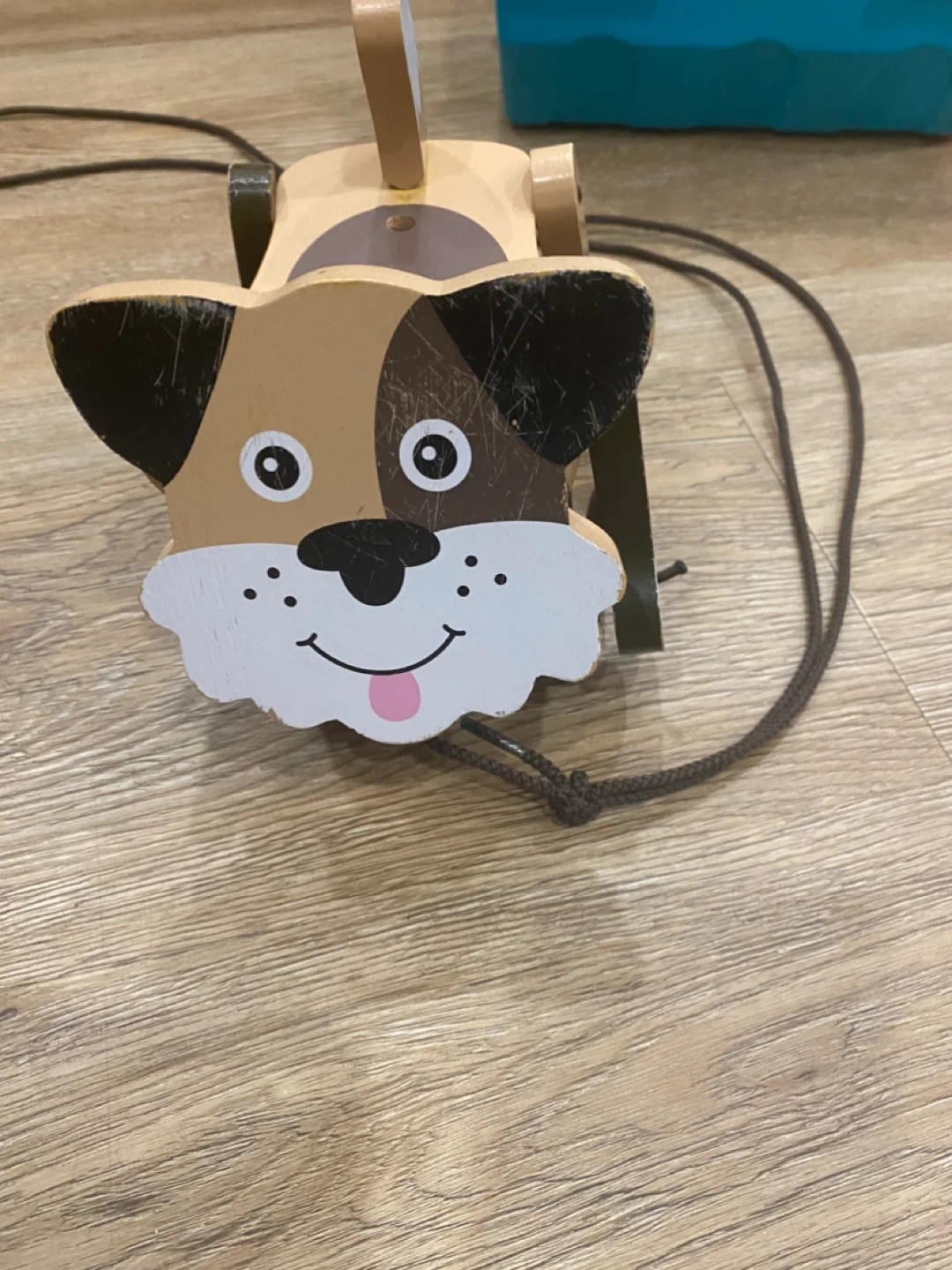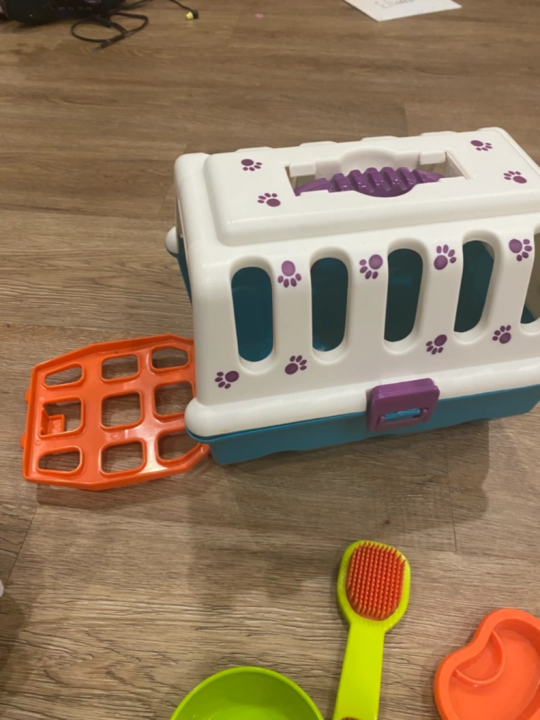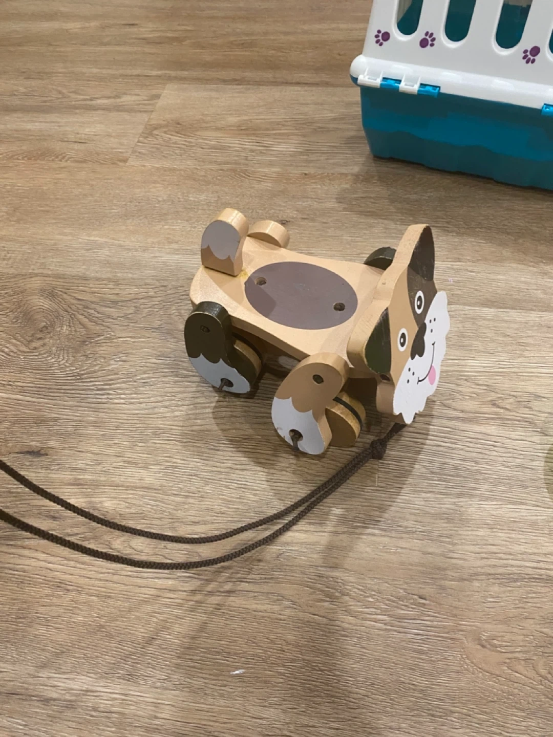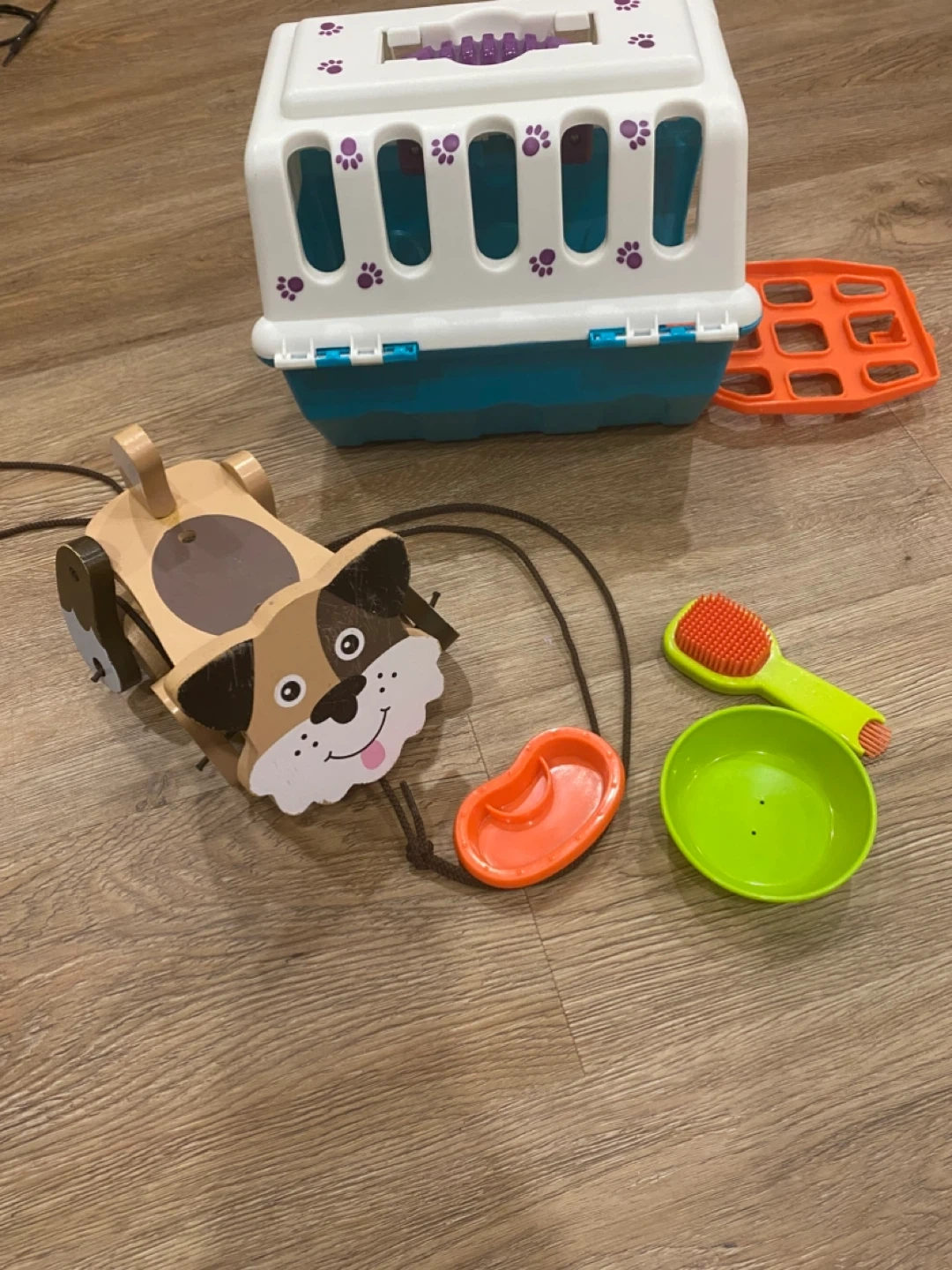 This is a Melissa and Doug wooden walking dog and battat toys pet carrier and care kit. The dog has a leash and can be walked. This carrier has an opening door, a pull-along puppy, a food bowl, and a brush. It's designed for little ones to care for their pretend pet. The carrier has paw print decorations and a handle for easy carrying.