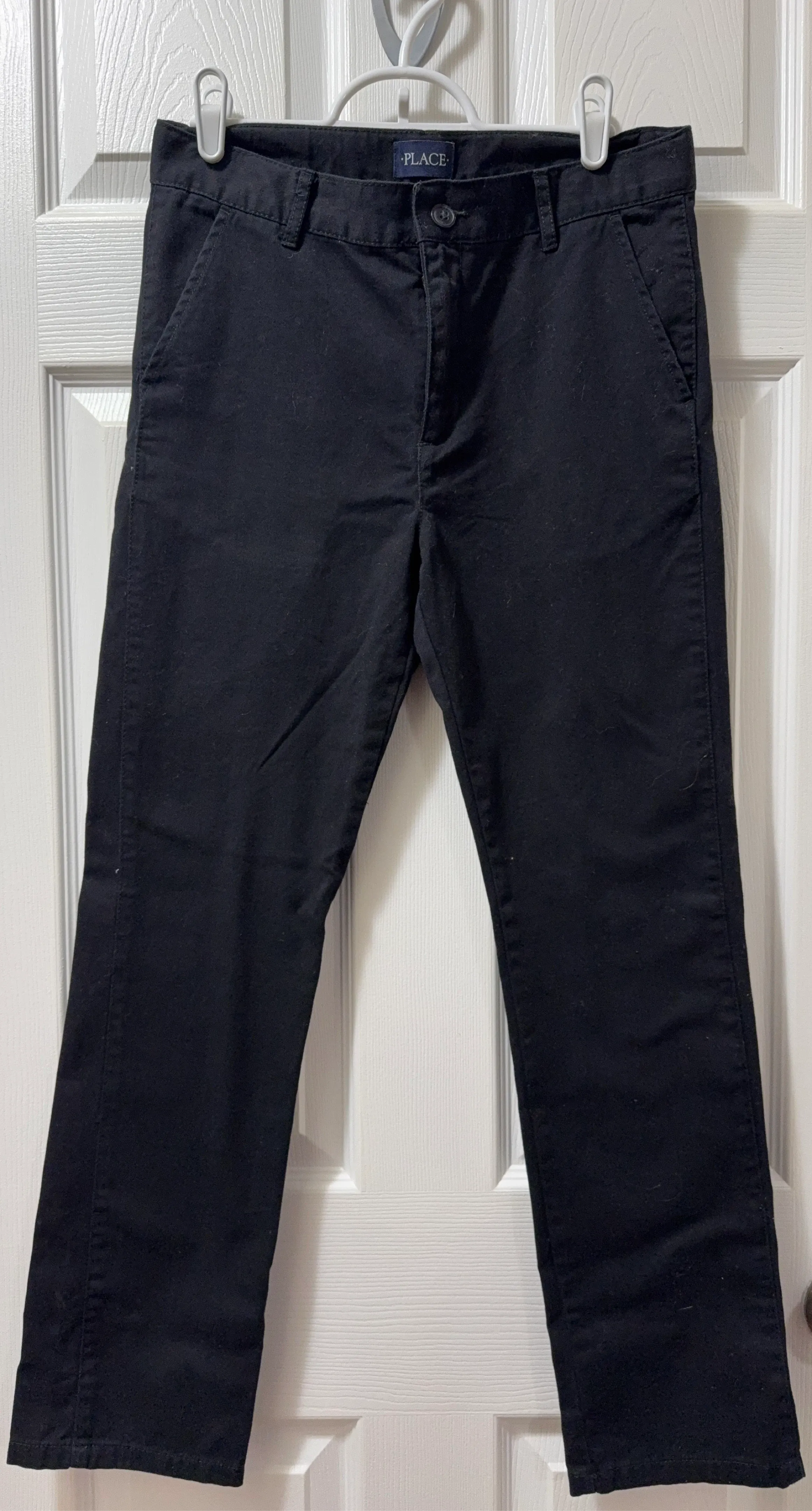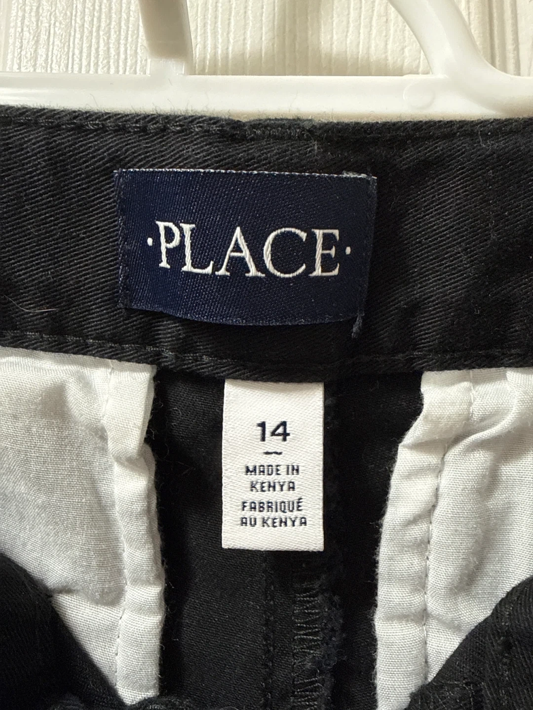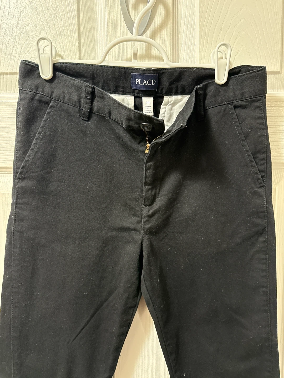 These are black pants from The Children's Place. They're a size 14. Made in Kenya. These pants are good for everyday wear.