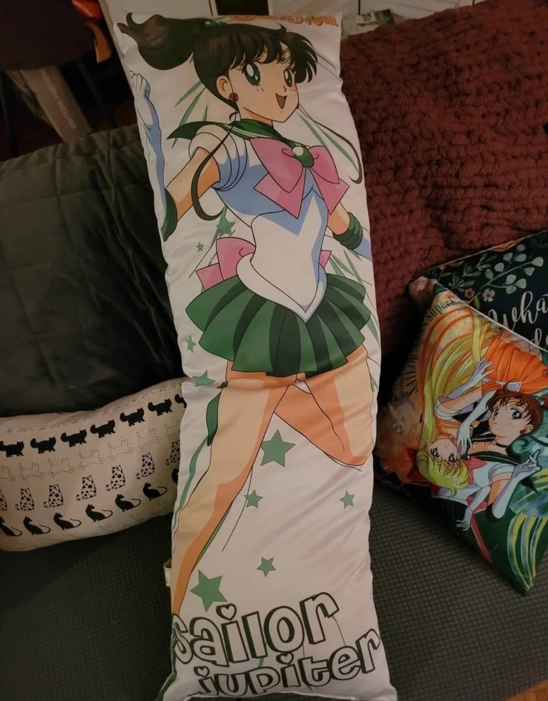 It's a body pillow featuring Sailor Jupiter from Sailor Moon. The pillow has a white cover with the character's image and name printed on it. It's a fun item for fans of the series!