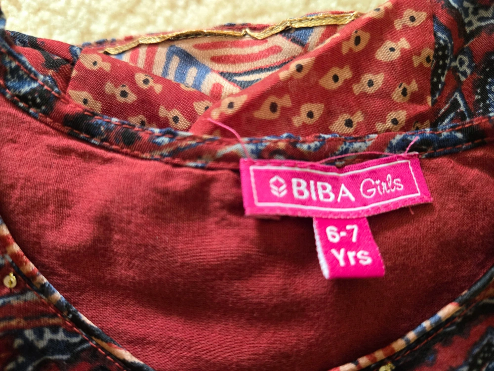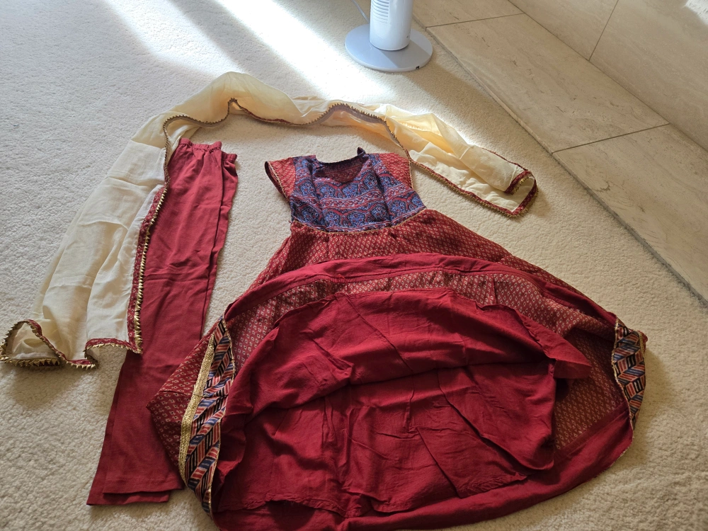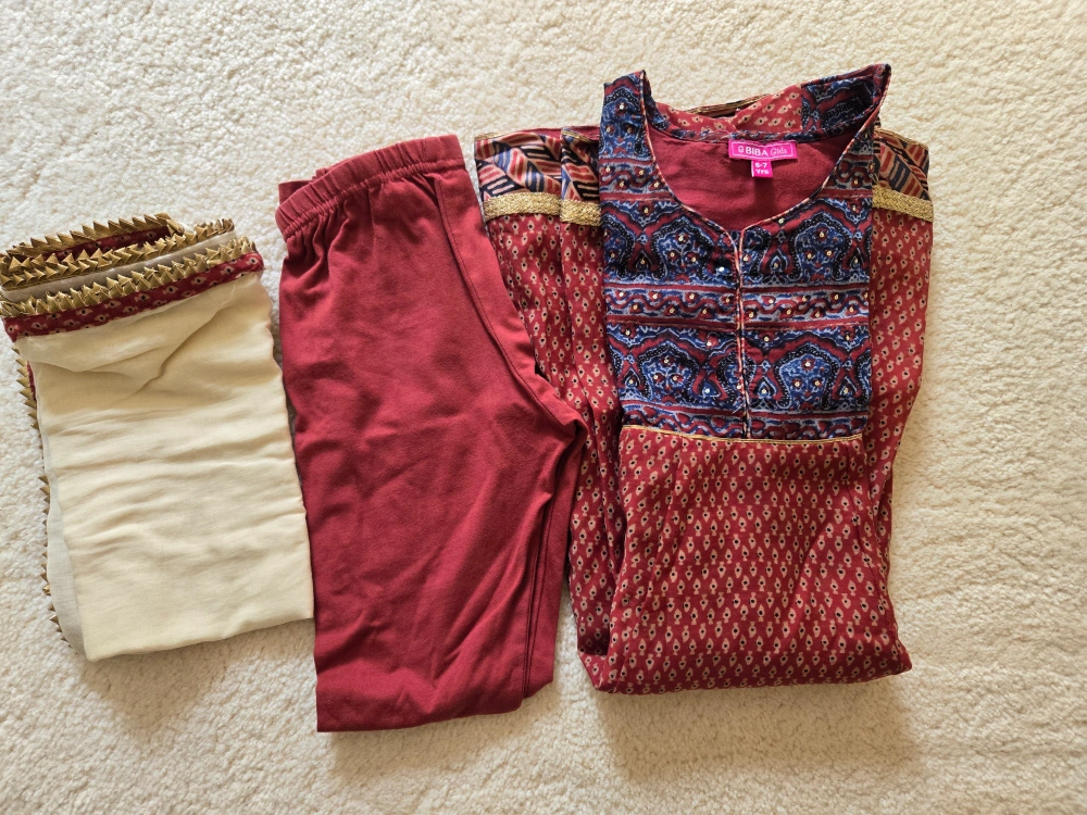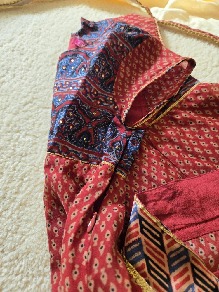 A beautiful salwar kameez for girls, size 6-7! This set includes the dress, pants, and dupatta. The dress features a lovely red and blue pattern with gold detailing, perfect for any special occasion. It's in great condition and ready for a new home.