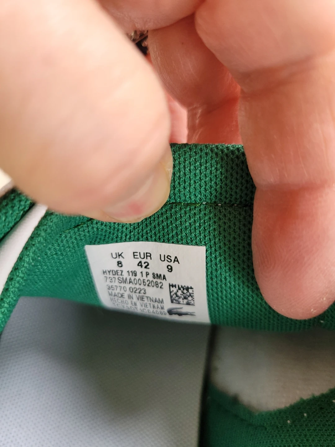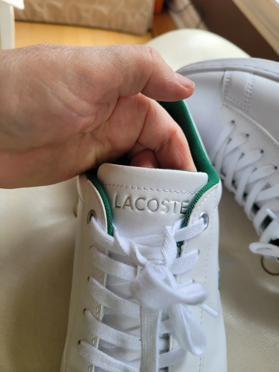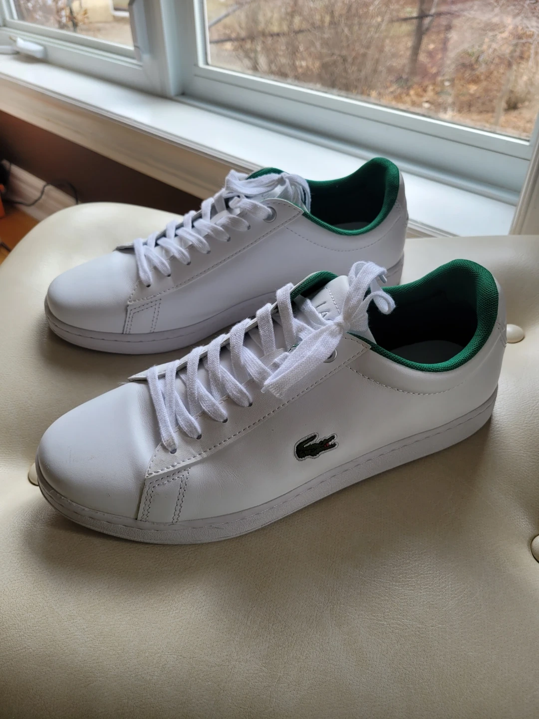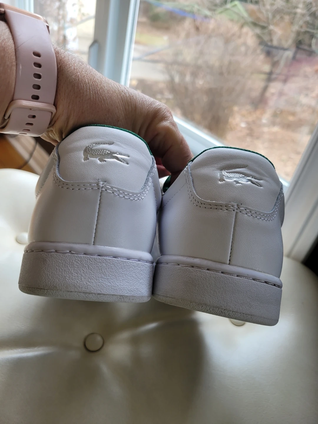 A classic pair of white leather Lacoste sneakers featuring a green trim inside the collar. They're lace-up style with a clean, minimalist design. Perfect for everyday wear! Sz 9 Extremely gently used.