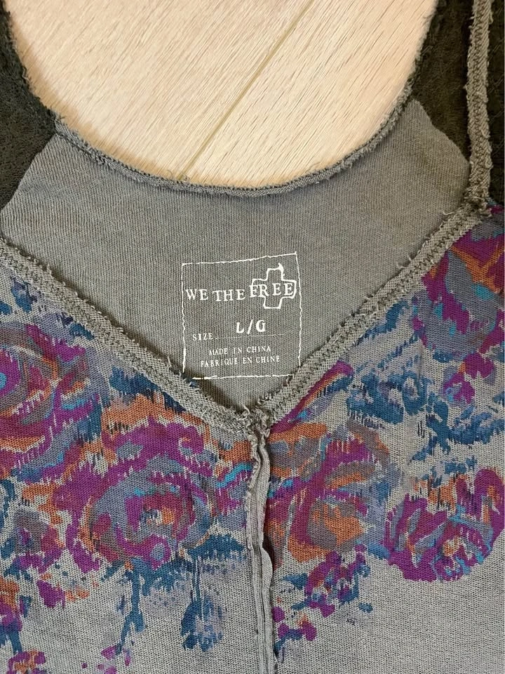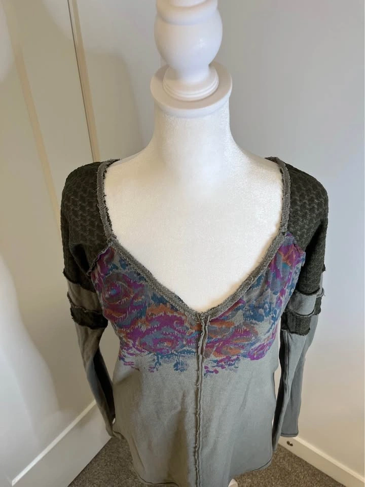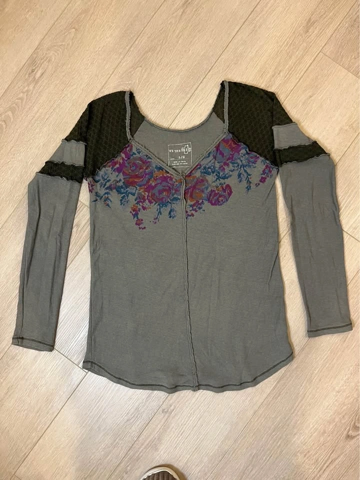 WE THE FREE olive-green long sleeve top. Vibrant floral print in purple and rust tones across the chest. Dark green textured crochet style fabric on the shoulders and sleeves. Scoop neckline with contrast raw-edge trim. Size L.