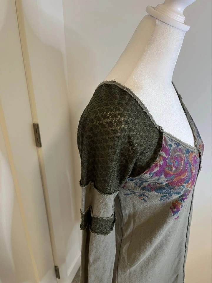WE THE FREE olive-green long sleeve top. Vibrant floral print in purple and rust tones across the chest. Dark green textured crochet style fabric on the shoulders and sleeves. Scoop neckline with contrast raw-edge trim. Size L.